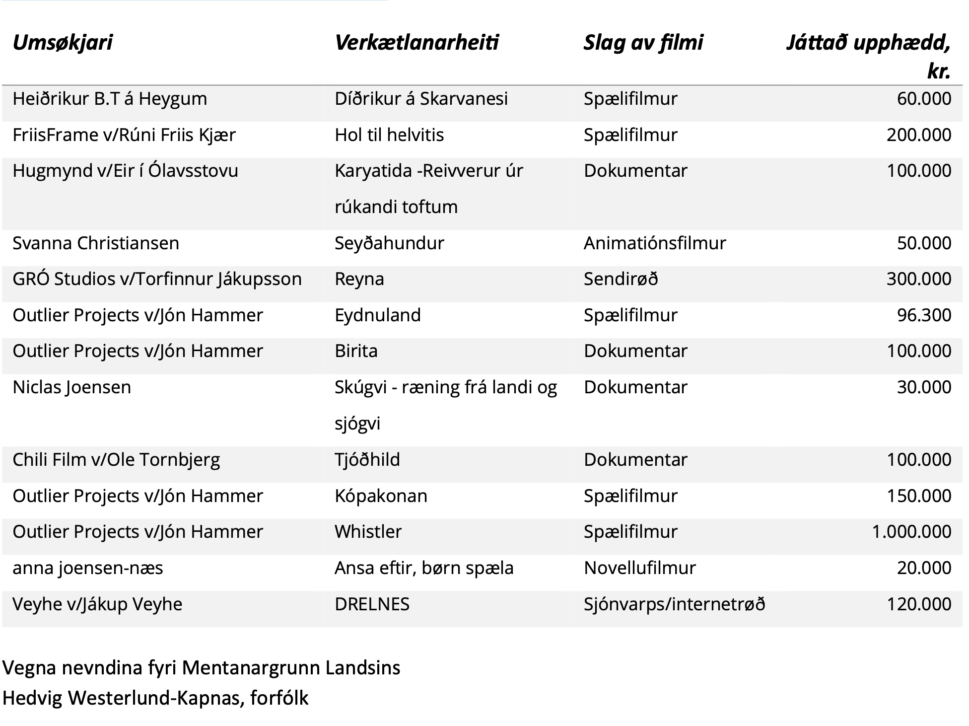 Til fyrsta stuðulsumfarið í ár, Filmur I. 2026, hevur nevndin í Mentanargrunni Landsins tikið avgerð um at veita hesum 13 filmsverkætlanunum stuðul: