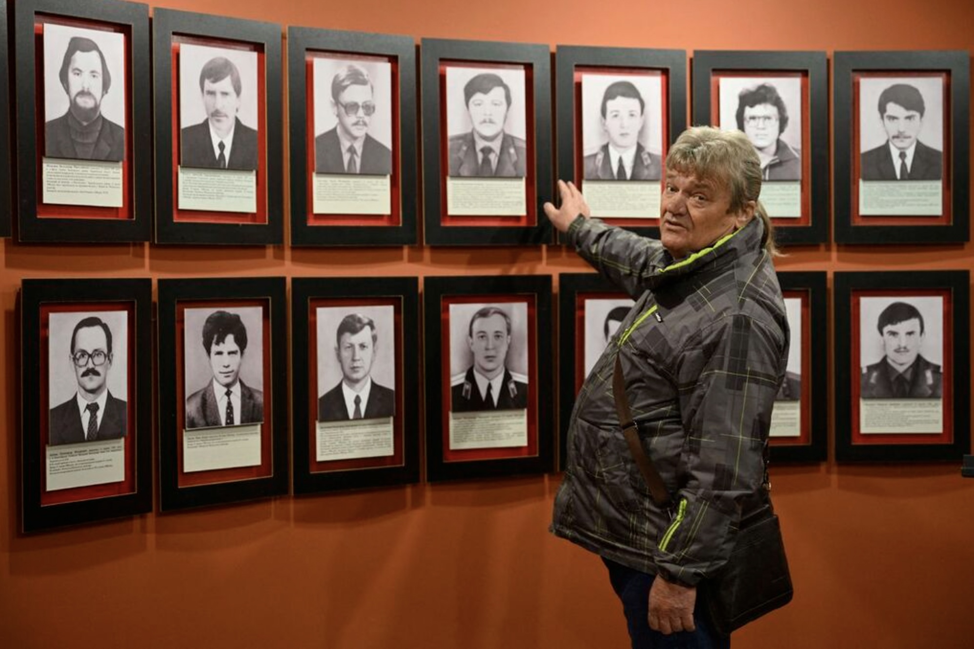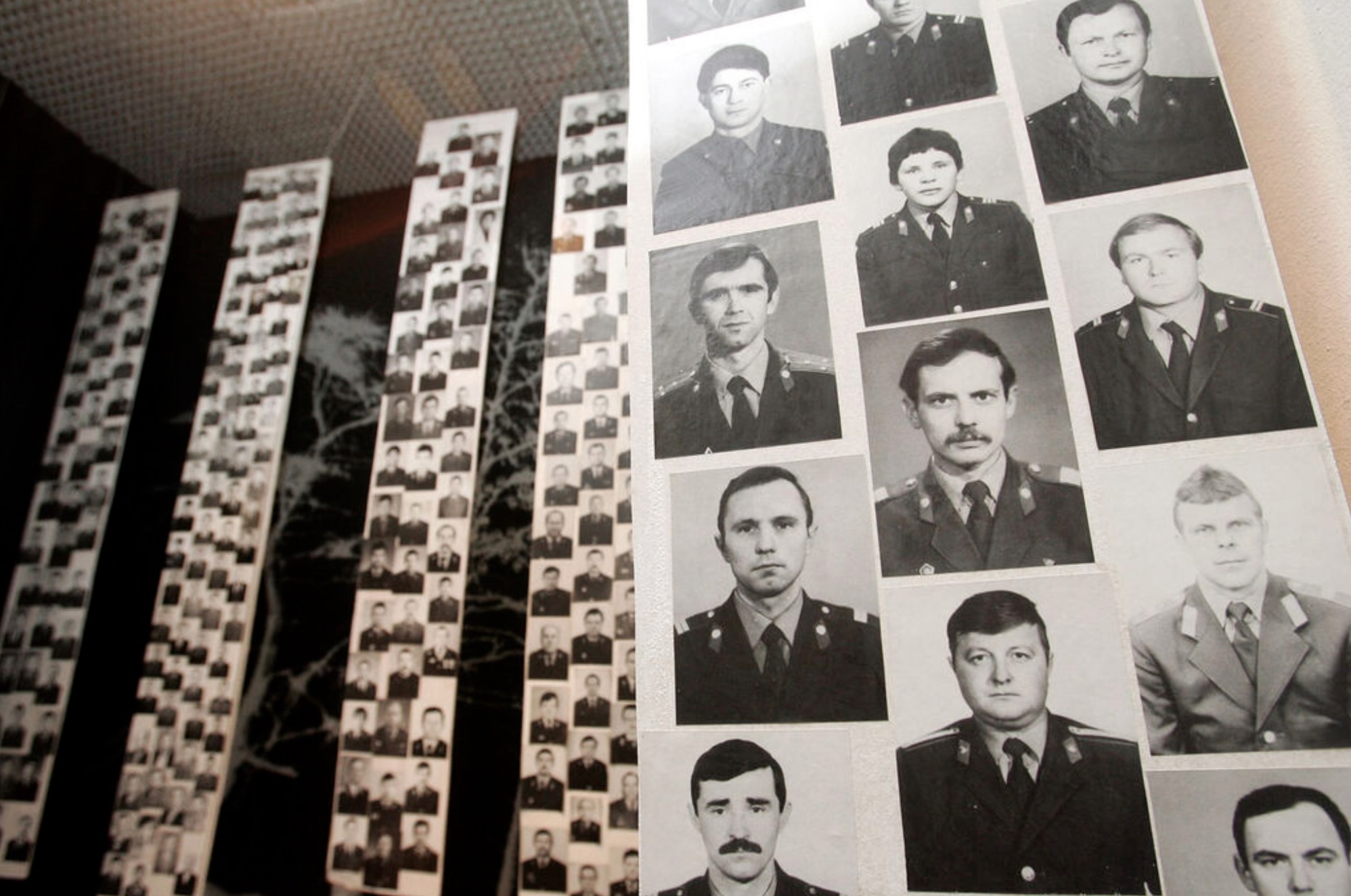 Pictures of deceased "liquidators" are arranged on a wall in Chernobyls catastrophe museum in Kiev watches on April 18, 2006. Ukraine will on April 30, 2026 mark the 40th anniversary of the Chernobyl accident, the worst civilian nuclear disaster in history. The risks of new radioactive releases still remain today, as the site is threatened by Russian strikes after it invaded the neighbour four years ago. (Photo by Sergei SUPINSKY / AFP)