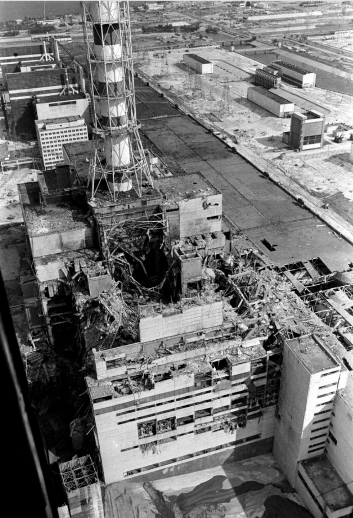 Picture taken from a helicopter in April 1986 shows a general view of the destroyed 4th power block of Chernobyls nuclear power plant, a few days after the catastrophe. Ukraine will on April 30, 2026 mark the 40th anniversary of the Chernobyl accident, the worst civilian nuclear disaster in history. The risks of new radioactive releases still remain today, as the site is threatened by Russian strikes after it invaded the neighbour four years ago. (Photo by VLADIMIR REPIK / AFP)