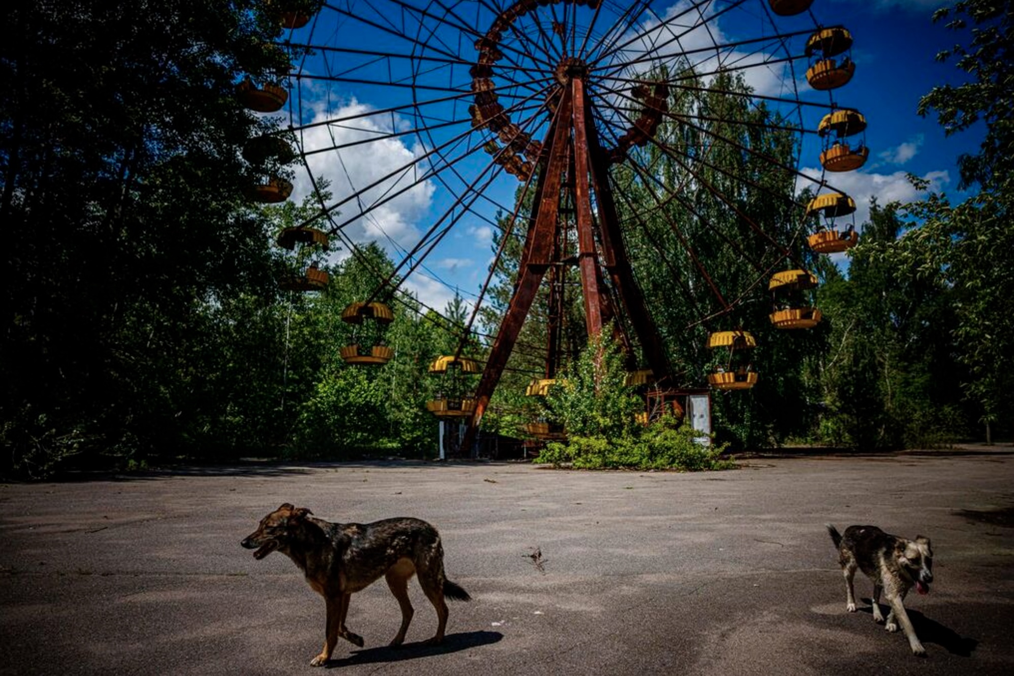 A photograph shows dogs passing by a Ferris wheel in background in the ghost town of Pripyat near the Chernobyl Nuclear Power Plant on May 29, 2022, amid the Russian invasion of Ukraine. Ukraine will on April 30, 2026 mark the 40th anniversary of the Chernobyl accident, the worst civilian nuclear disaster in history. The risks of new radioactive releases still remain today, as the site is threatened by Russian strikes after it invaded the neighbour four years ago. (Photo by Dimitar DILKOFF / AFP)