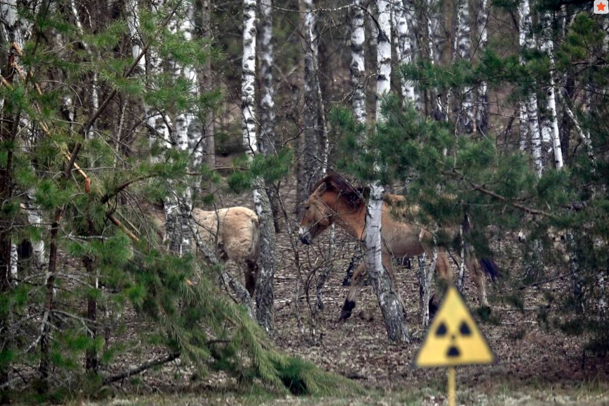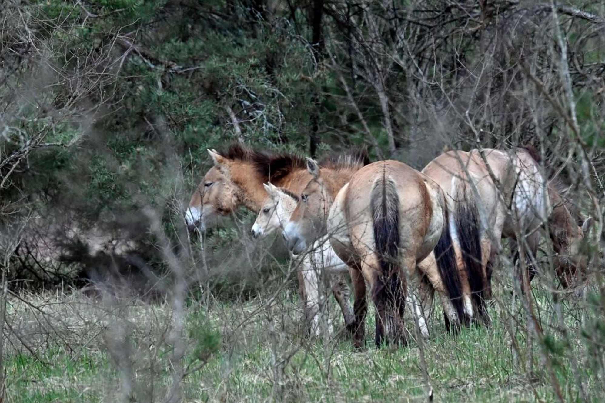 Wild Przewalskis horses, endangered species native to Asia, that thrives in a radioactively contaminated area, roam near a forest road in the Chornobyl zone on April 23, 2026. Ukraine will on April 30, 2026 mark the 40th anniversary of the Chernobyl accident, the worst civilian nuclear disaster in history. The risks of new radioactive releases still remain today, as the site is threatened by Russian strikes after it invaded the neighbour four years ago. (Photo by Sergei SUPINSKY / AFP)