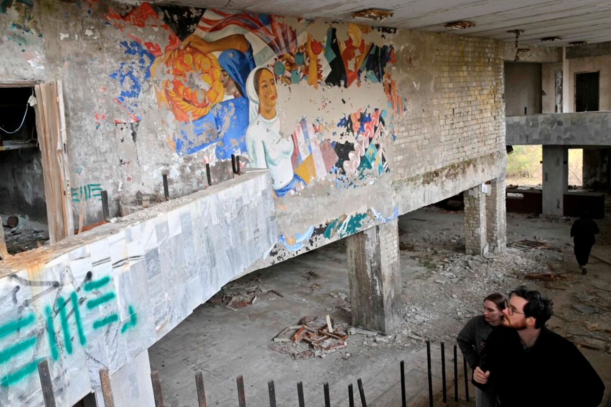 Visitors walk in the abandoned Energetic Culture Palace in the ghost city of Pripyat near Chernobyl Nuclear Power Plant on April 23, 2026. Ukraine will on April 30, 2026 mark the 40th anniversary of the Chernobyl accident, the worst civilian nuclear disaster in history. The risks of new radioactive releases still remain today, as the site is threatened by Russian strikes after it invaded the neighbour four years ago. (Photo by Sergei SUPINSKY / AFP)