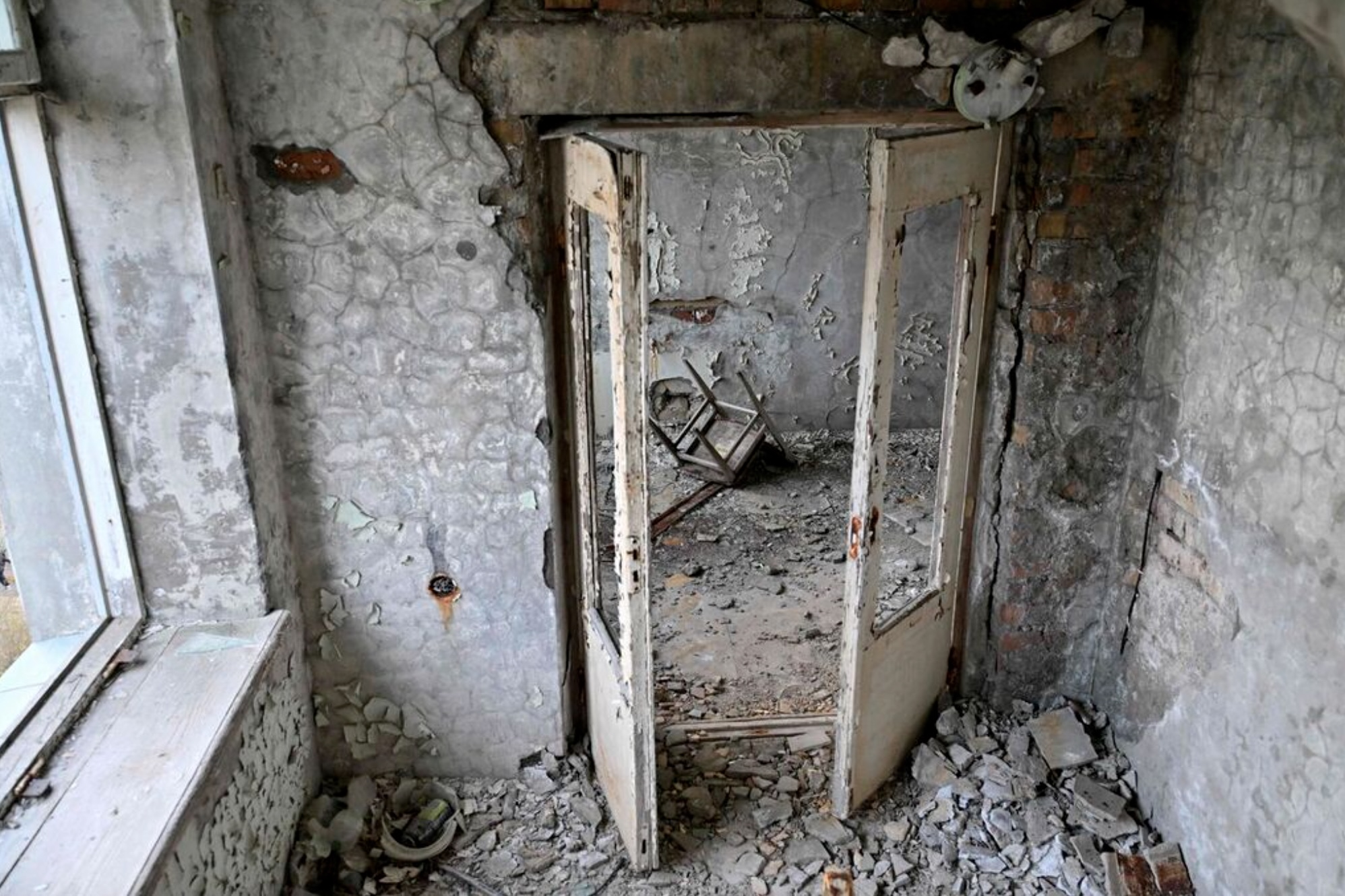 This photograph shows a room in an abandoned hotel in the ghost city of Pripyat near Chernobyl Nuclear Power Plant on April 23, 2026. Ukraine will on April 30, 2026 mark the 40th anniversary of the Chernobyl accident, the worst civilian nuclear disaster in history. The risks of new radioactive releases still remain today, as the site is threatened by Russian strikes after it invaded the neighbour four years ago. (Photo by Sergei SUPINSKY / AFP)