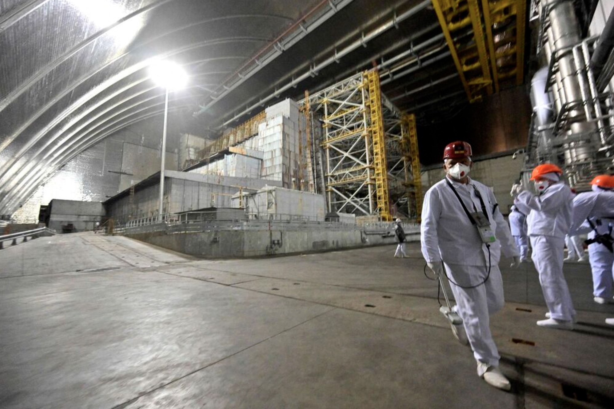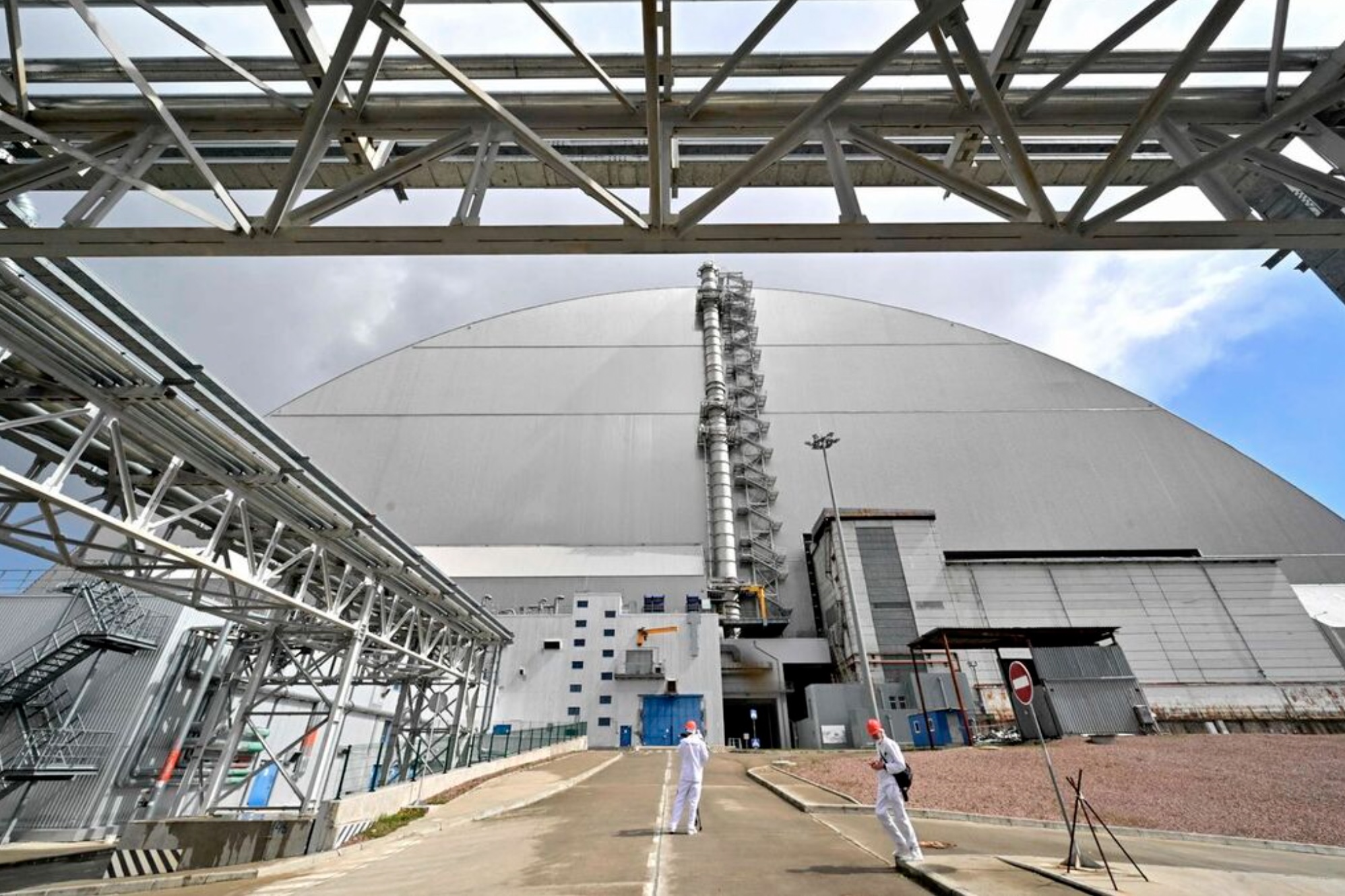 Employees and visitors walk in front of the sarcophagus covering the destroyed fourth reactor under the New Safe Confinement (NSC) at the Chernobyl Nuclear Power on April 24, 2026. Ukraine will on April 26, 2026 mark the 40th anniversary of the Chernobyl accident, the worst civilian nuclear disaster in history. The risks of new radioactive releases still remain today, as the site is threatened by Russian strikes after it invaded the neighbour four years ago. (Photo by Sergei SUPINSKY / AFP)