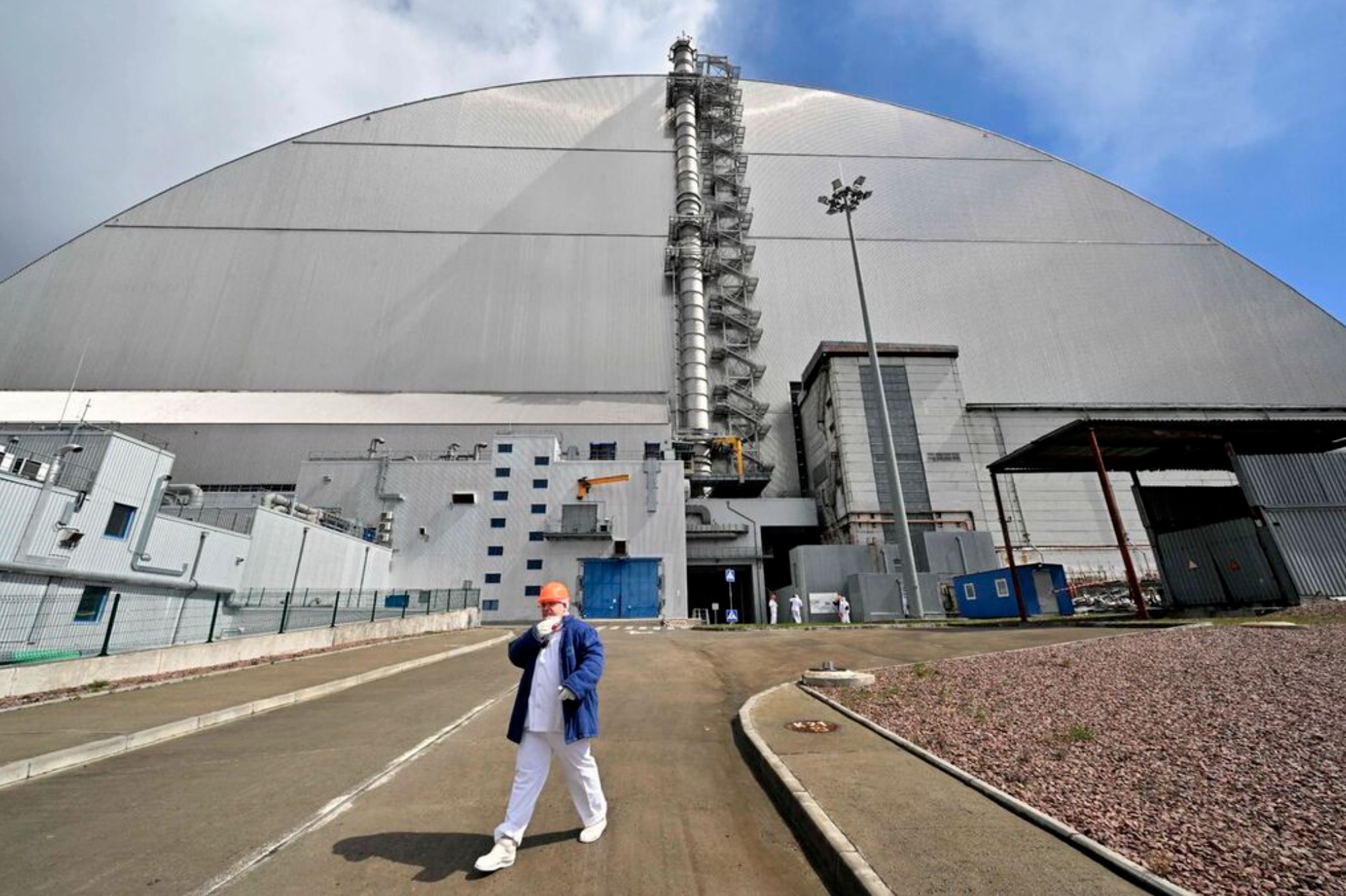 An employee walks past the New Safe Confinement (NSC), covering the destroyed fourth reactor at the Chernobyl Nuclear Power Plant on April 23, 2026. Ukraine will on April 26, 2026 mark the 40th anniversary of the Chernobyl accident, the worst civilian nuclear disaster in history. The risks of new radioactive releases still remain today, as the site is threatened by Russian strikes after it invaded the neighbour four years ago. (Photo by Sergei SUPINSKY / AFP)