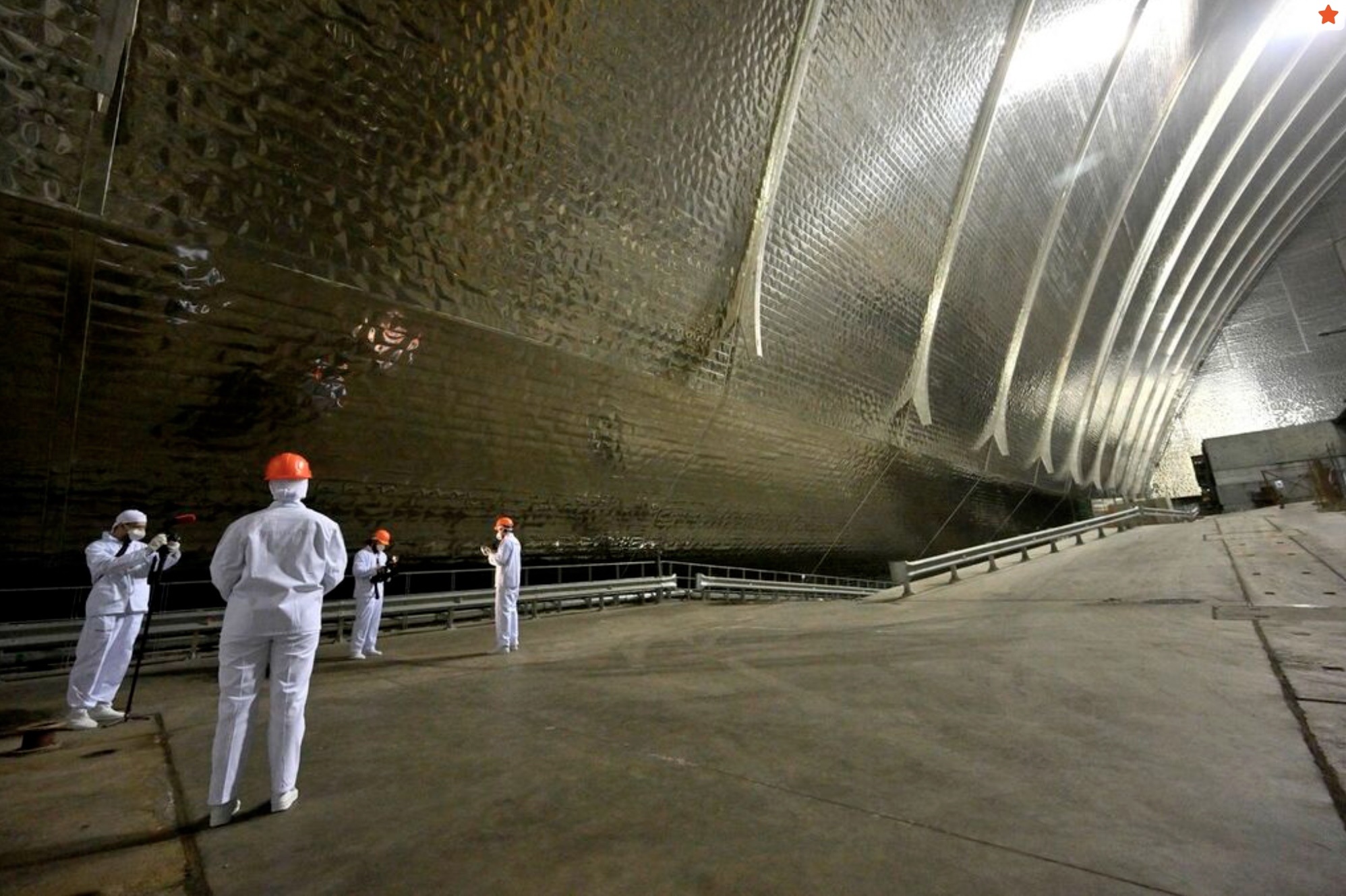 Employees stand in front of New Safe Confinement (NSC), covering the destroyed fourth reactor at the Chernobyl Nuclear Power Plant on April 23, 2026. Ukraine will on April 26, 2026 mark the 40th anniversary of the Chernobyl accident, the worst civilian nuclear disaster in history. The risks of new radioactive releases still remain today, as the site is threatened by Russian strikes after it invaded the neighbour four years ago. (Photo by Sergei SUPINSKY / AFP)