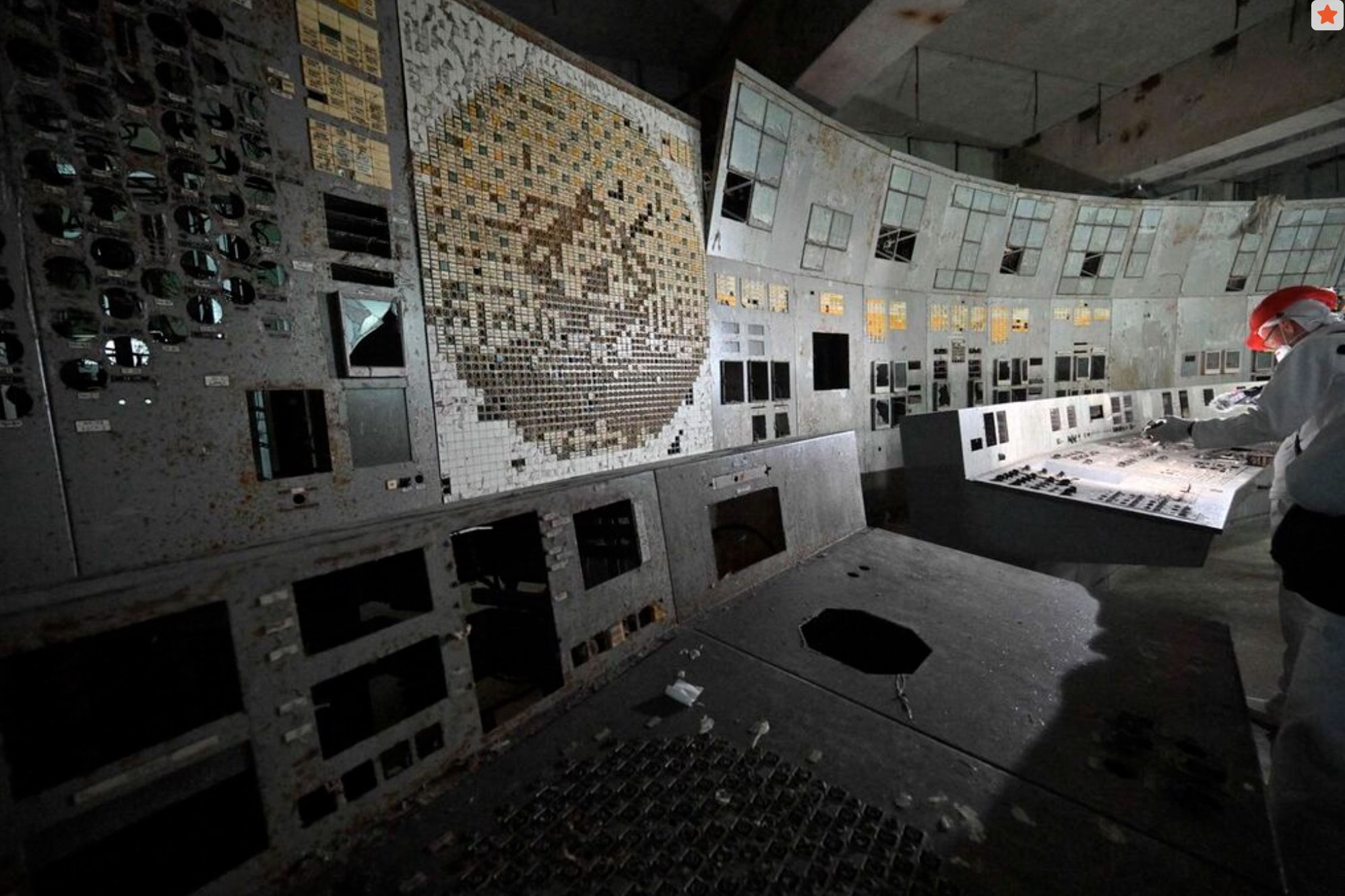 A visitor of the Chernobyl Nuclear Power Plant films in the control room of the destroyed 4th block of the plant on April 23, 2026. Ukraine will on April 26, 2026 mark the 40th anniversary of the Chernobyl accident, the worst civilian nuclear disaster in history. The risks of new radioactive releases still remain today, as the site is threatened by Russian strikes after it invaded the neighbour four years ago. (Photo by Sergei SUPINSKY / AFP)