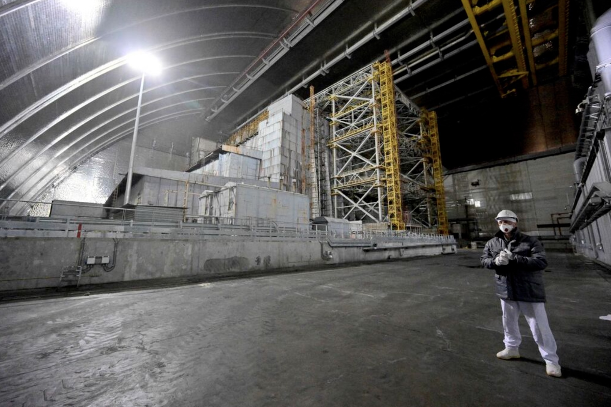 An employee stands in front of the sarcophagus covering the destroyed fourth reactor under the New Safe Confinement (NSC) at the Chornobyl Nuclear Power on April 24, 2026. Ukraine will on April 26, 2026 mark the 40th anniversary of the Chernobyl accident, the worst civilian nuclear disaster in history. The risks of new radioactive releases still remain today, as the site is threatened by Russian strikes after it invaded the neighbour four years ago. (Photo by Sergei SUPINSKY / AFP)