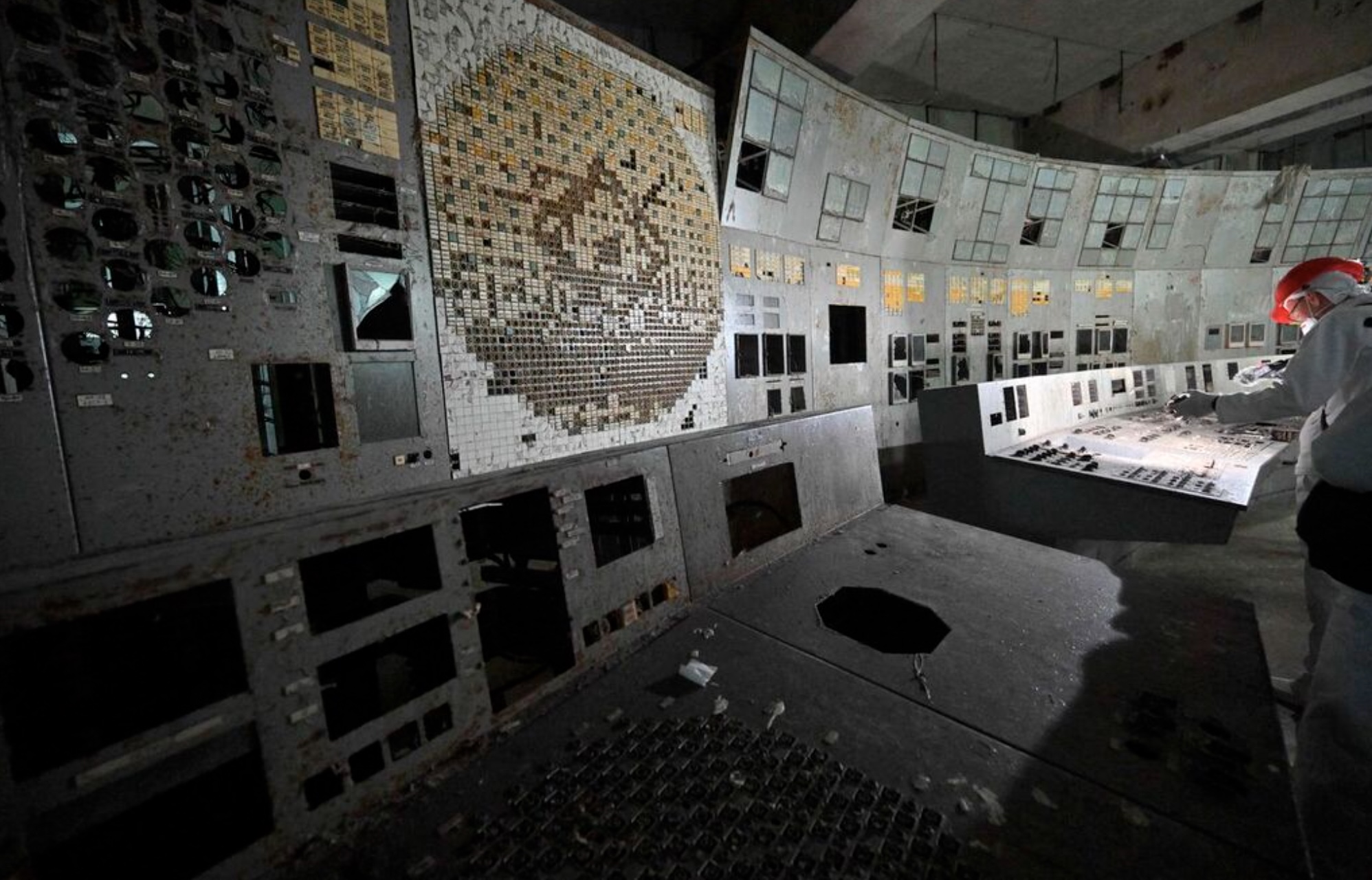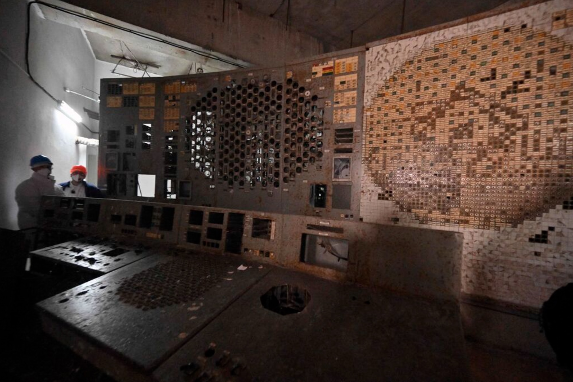Employees of the Chernobyl Nuclear Power Plant visit in the control room of the destroyed 4th block of the plant on April 23, 2026. Ukraine will on April 26, 2026 mark the 40th anniversary of the Chernobyl accident, the worst civilian nuclear disaster in history. The risks of new radioactive releases still remain today, as the site is threatened by Russian strikes after it invaded the neighbour four years ago. (Photo by Sergei SUPINSKY / AFP)