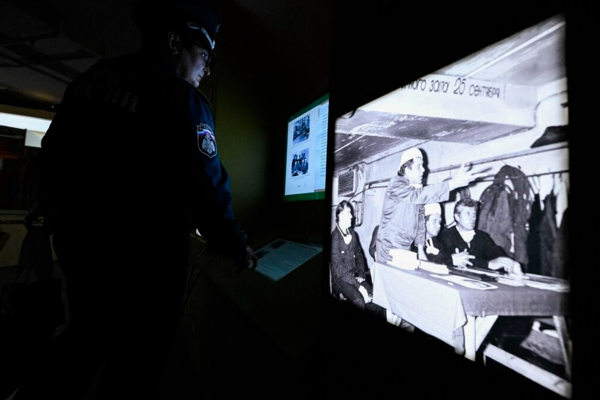 An Emergency Services employee scrolls information about Chernobyl tragedy at a temporary display dedicated to the 40th anniversary of the explosion at the Chernobyl nuclear power plant - the worst civilian nuclear disaster in history, at the Atom pavilion, a permanent exhibition centre designed to demonstrate Russias main past and modern achievements of the nuclear power industry, at the All-Russia Exhibition Centre (VDNH) in Moscow on April 24, 2026. (Photo by Igor IVANKO / AFP)