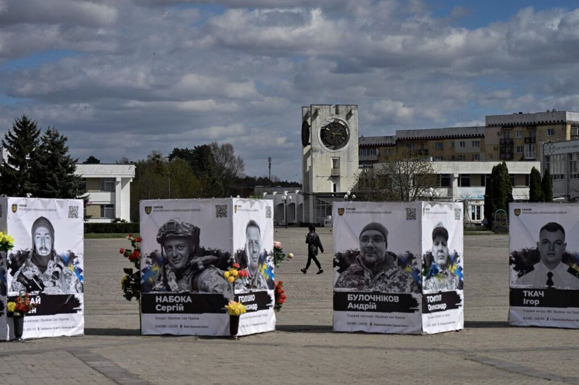 A pedestrian walks past portraits of fallen Ukrainian defenders in the central square of the town of Slavutych on April 24, 2026, amid the Russian invasion of Ukraine. Ukraine will on April 26, 2026 mark the 40th anniversary of the Chernobyl accident, the worst civilian nuclear disaster in history. The risks of new radioactive releases still remain today, as the site is threatened by Russian strikes after it invaded the neighbour four years ago. (Photo by Genya SAVILOV / AFP)