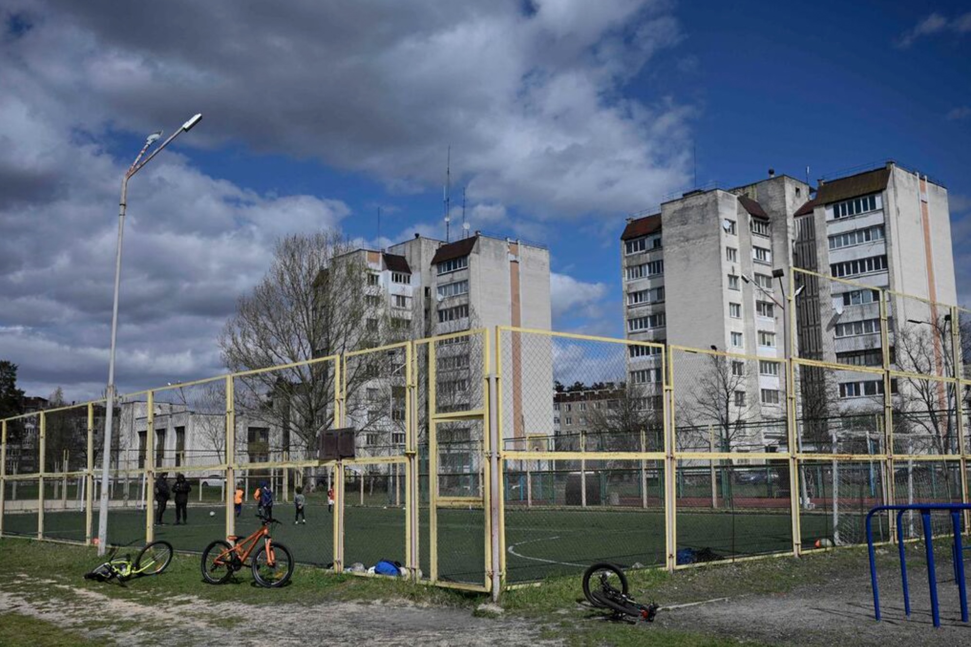 Children takes part in a football game at a playground in the town of Slavutych on April 24, 2026, amid the Russian invasion of Ukraine. Ukraine will on April 26, 2026 mark the 40th anniversary of the Chernobyl accident, the worst civilian nuclear disaster in history. The risks of new radioactive releases still remain today, as the site is threatened by Russian strikes after it invaded the neighbour four years ago. (Photo by Genya SAVILOV / AFP)