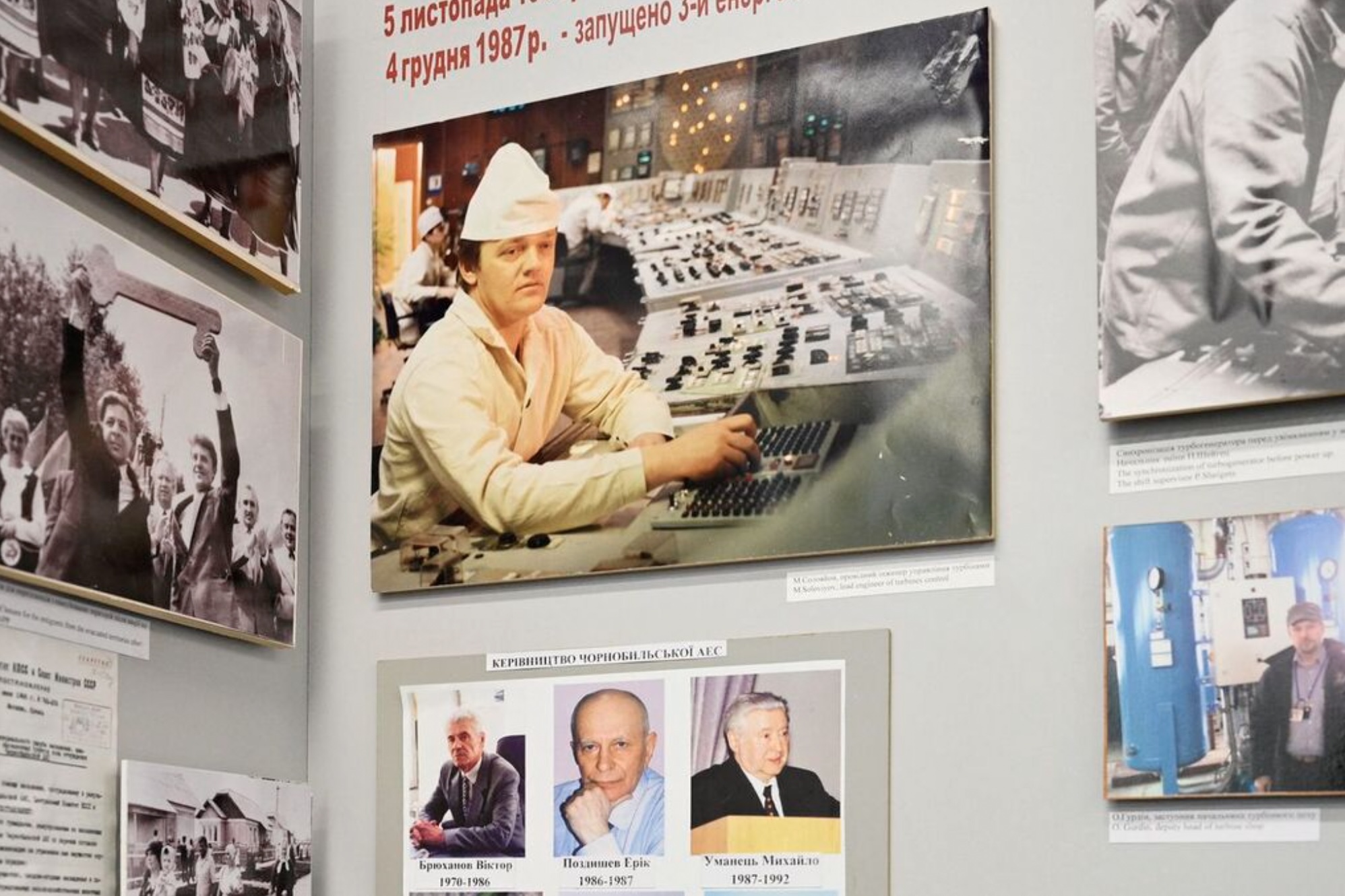 This photograph shows a fragment of exposition with a portrait of Nikolay Solovyov in the control room of the 3rd power block in the early 90s (center-up) in the Museum of the town of Slavutych and the Chernobyl Nuclear Power Plant on April 24, 2026, amid the Russian invasion of Ukraine. It was Nikolay Solovyovs shift on the night of April 26, 1986, when the Chernobyl nuclear power plant exploded. In the aftermath, he hadnt fled, choosing instead to fight his "first war, " against radiation. Solovyov, who received high doses of radiation and has undergone countless medical checks, attributes his longevity to good health, regular sport, a calm temperament and genetics. Ukraine will on April 26, 2026, mark the 40th anniversary of the Chernobyl accident, the worst civilian nuclear disaster in history. (Photo by Genya SAVILOV / AFP)
