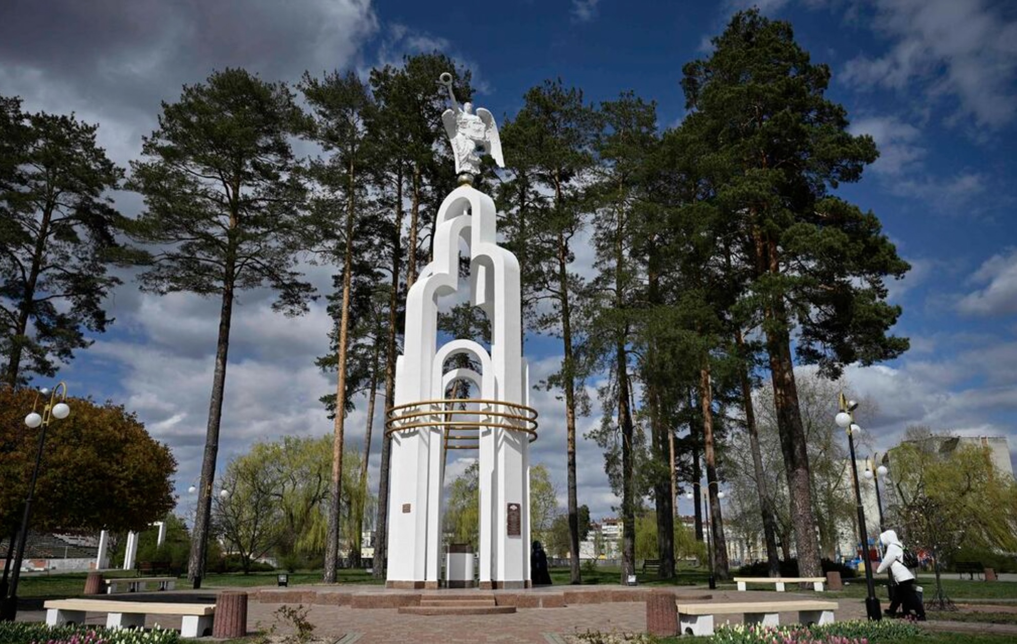 Pedestrians walk past the White Angel of Slavutych monument in the central square of the town of Slavutych on April 24, 2026, amid the Russian invasion of Ukraine. Ukraine will on April 26, 2026 mark the 40th anniversary of the Chernobyl accident, the worst civilian nuclear disaster in history. The risks of new radioactive releases still remain today, as the site is threatened by Russian strikes after it invaded the neighbour four years ago. (Photo by Genya SAVILOV / AFP)