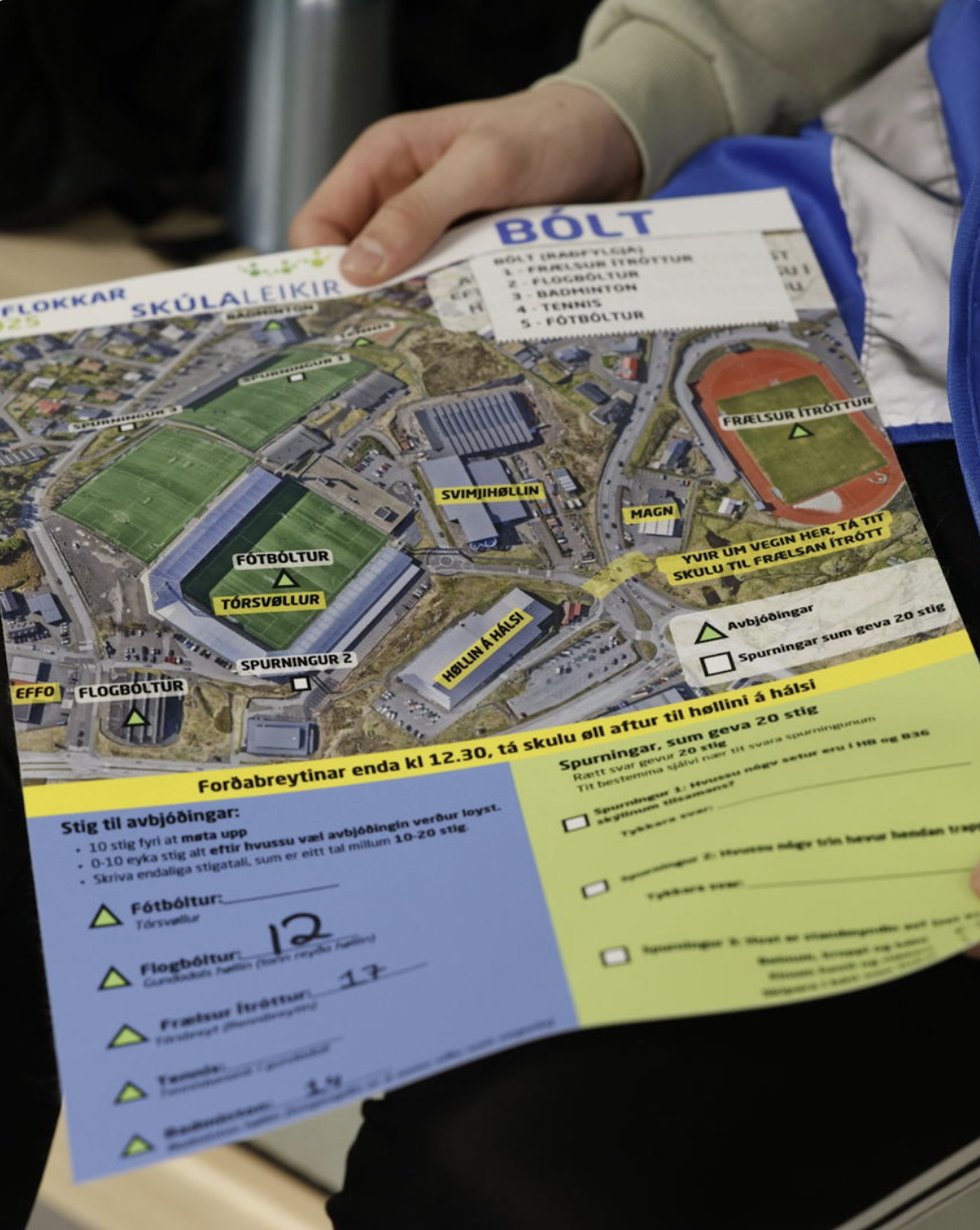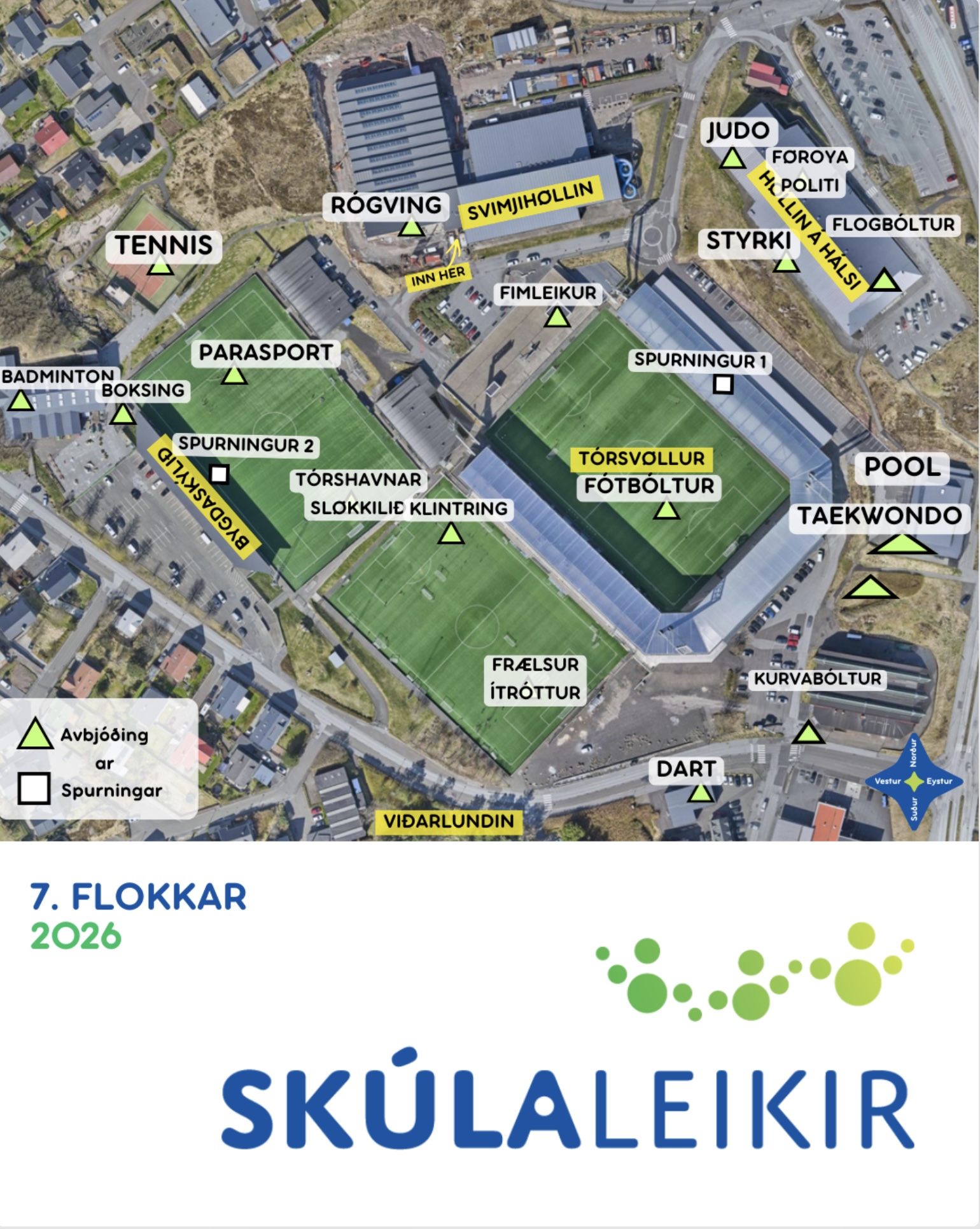 16 ymiskar ítróttagreinar bjóða seg fram til stevnuna fyri 7. flokkar í morgin, og hartil koma umboð frá løgregluni og sløkkiliðnum, sum eisini fara at skipa tvær avbjóðingar. Vit gleða okkum til felagsskap og rørslugleði fyri næmingar í 7. flokki. Og vit gleða okkum til at hittast tvørtur um oyggjar og royna nýggjar avbjóðingar sum dart, boksing og pool, sum eru heilt nýggjar greinar í Skúlaleikahøpi.