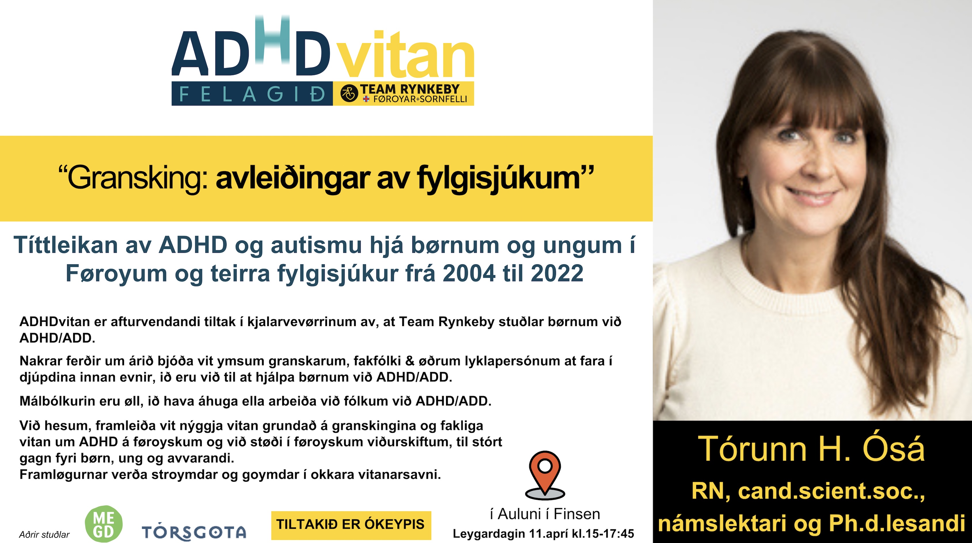 Tórunn fer millum annað at greiða frá títtleikanum av ADHD og autismu hjá børnum og ungum í Føroyum frá 2004 til 2022, og hvørjar fylgisjúkur kunnu standast, tá útgreiningin kemur ov seint.