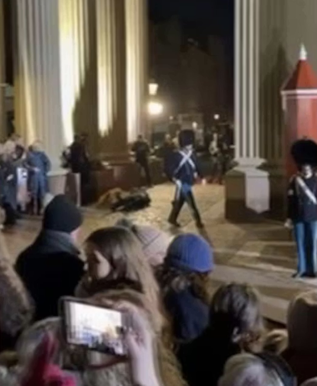 Beinleiðis sjónvarpsmyndir vístu í stuttum, hvussu eitt ókent tal av aktivistum gingu framvið gardunum hjá Den Kongelige Livgarde.