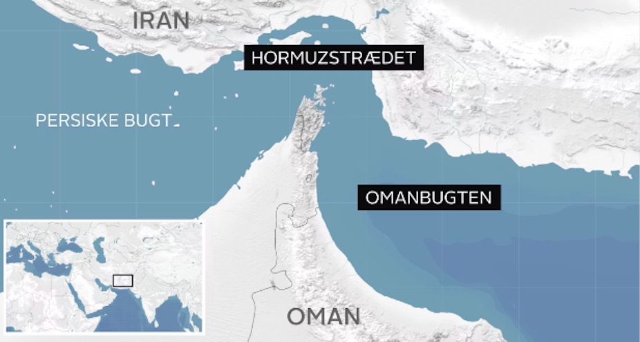 Hormussundið liggur millum Iran og Oman, soleiðis sum myndin omanfyri vísir.