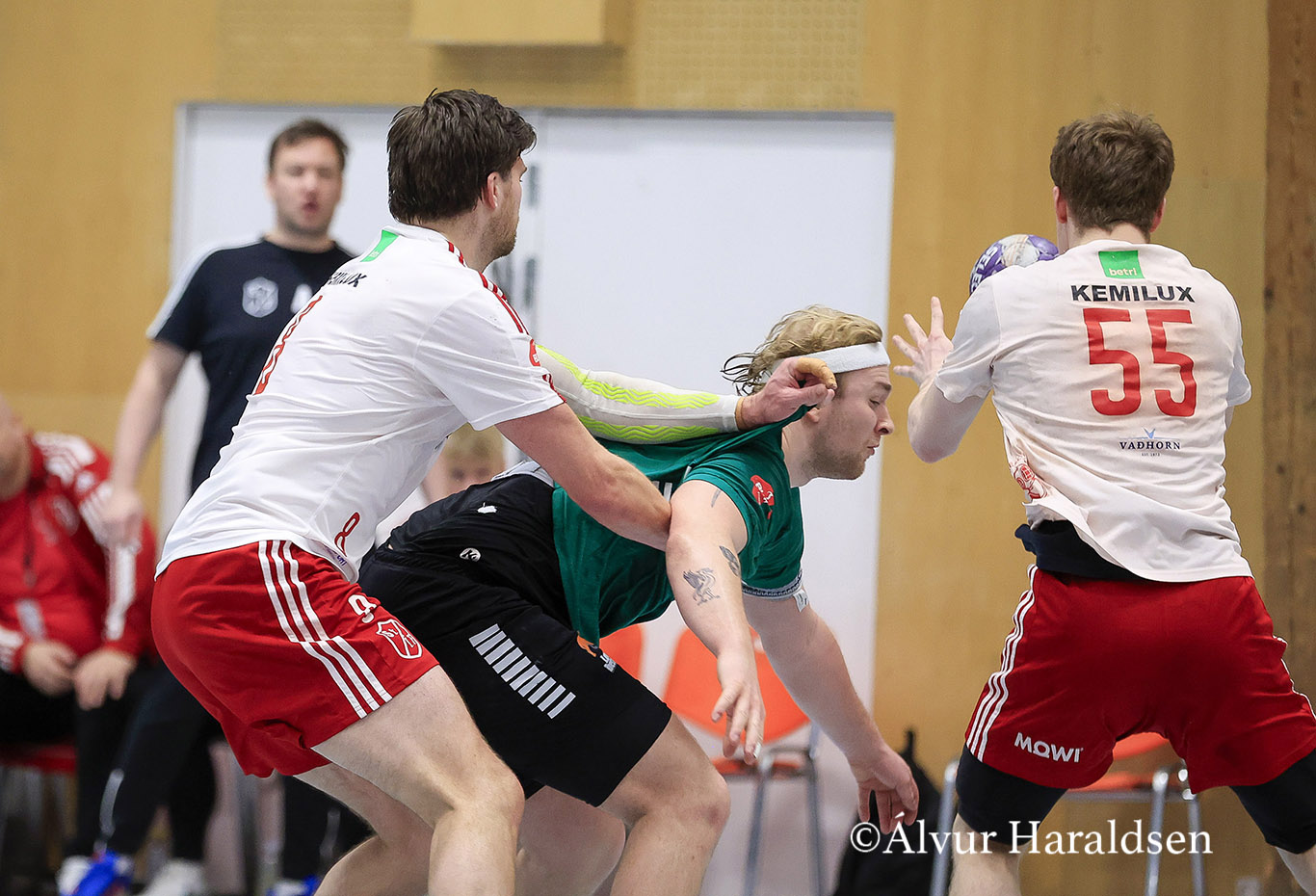 Kyndil vann sær ein fyrimun í hesum stríðnum við at vinna 27-25 á StÍF í høllini á Skála. Í steðginum vóru kyndilsmenn á odda 15-12. Tá 19 sekund vóru eftir skoraði Jón Eyðunsson Midjord fyri StÍF til støðuna 25-26. Tvey sekund undan dystarloki staðfesti Teitur Poulsen Hellisdal sigurin hjá Kyndli.