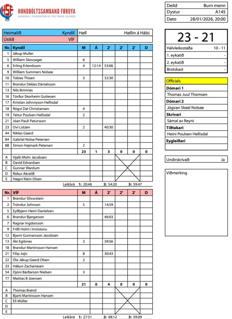 HER ber til frá HSF at síggja dómaraseðlarnar frá kvøldsins dystum, umframt støðuna í deildini: