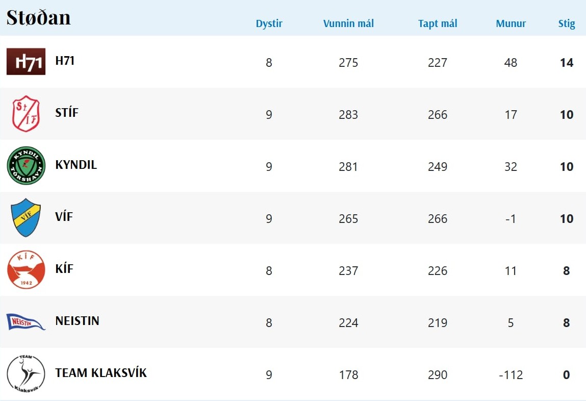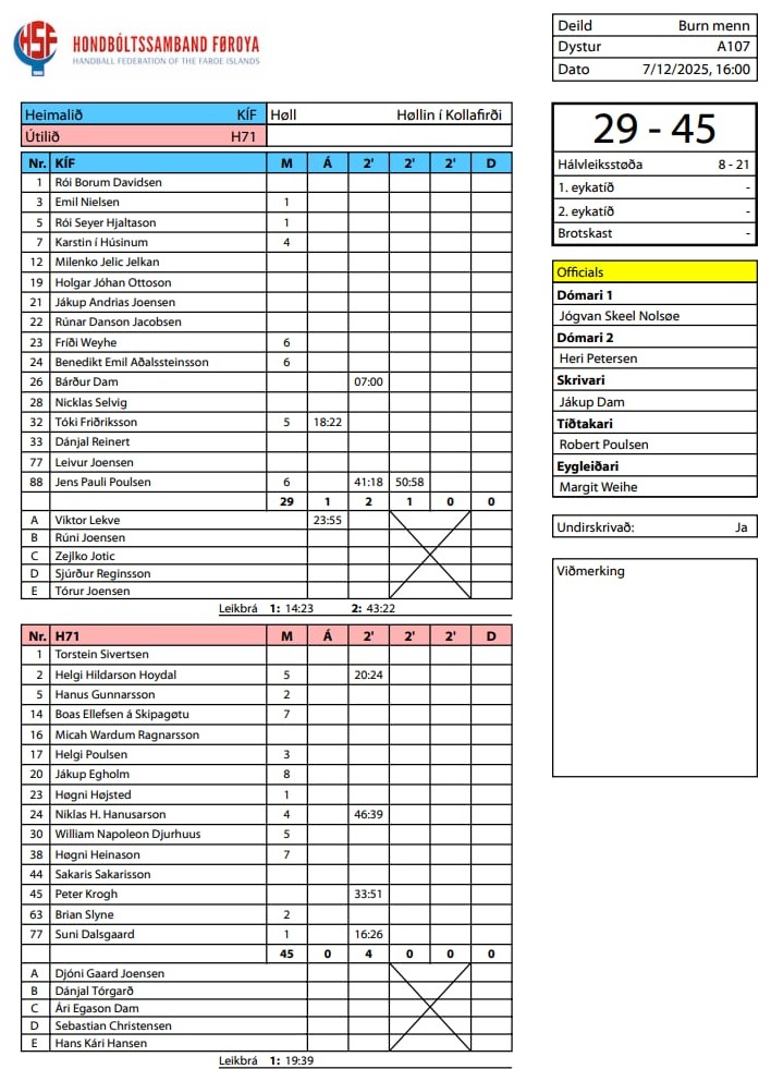 Í høllini í Kollafirði vóru heili 74 mál skotin, tá H71 vann stórsigur 45-29 á KÍF. Í steðginum var longu greitt, at hoyvíkingar fóru at vinna dystin. Støðan í steðginum var 21-8 til H71.