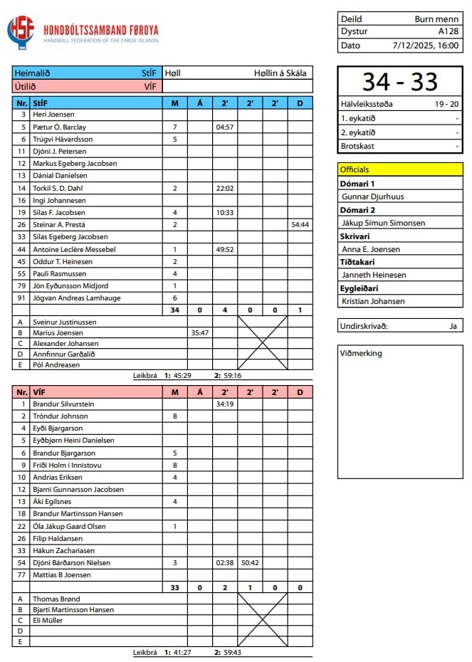 Í høllini á Skála vann StÍF ein tepran 34-33 sigur á VÍF. Í steðginum vóru vestmenningar á odda 20-19.
