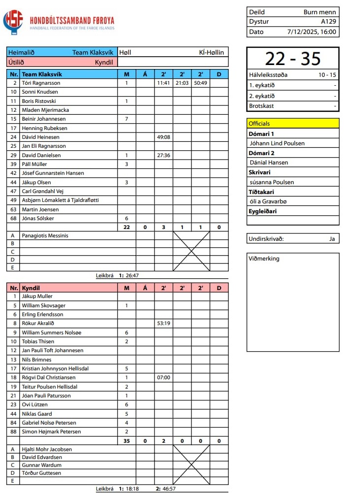 Í KÍ-høllini vann Kyndil stórsigur 35-22 á Team Klaksvík. Kyndil var á odda 15-10 í steðginum.