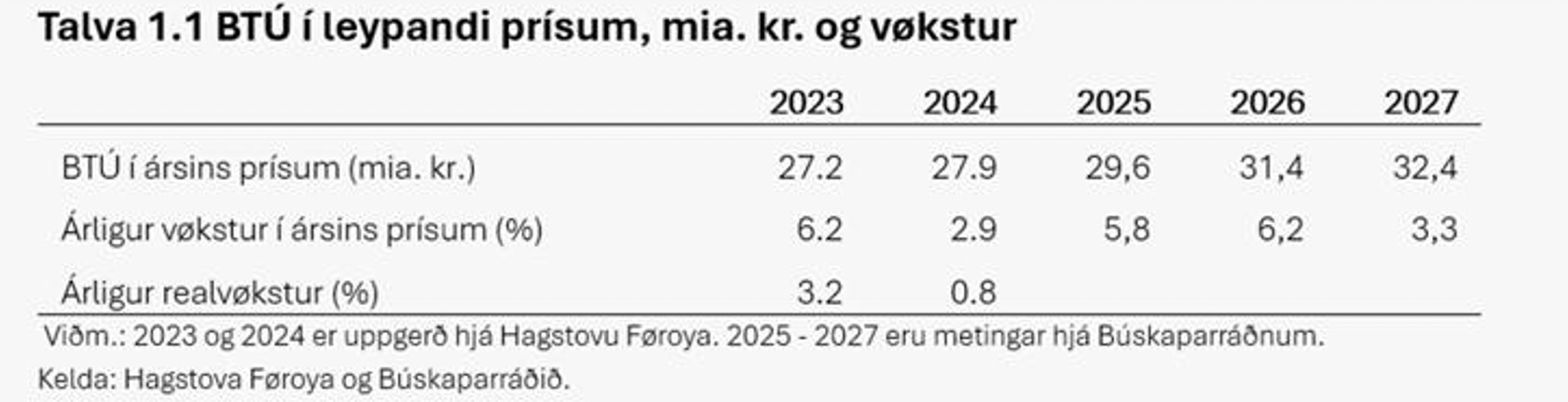 Búskaparráðið hevur í samstarvi við Hagstovu Føroya mett um vøksturin í BTÚ fyri árini 2025 – 2027. Vøksturin í BTÚ í leypandi prísum er mettur at vera ávikavist 5,8% í 2025, 6,2% 2026 og 3,3% í 2027, sí talvu 1 niðanfyri.