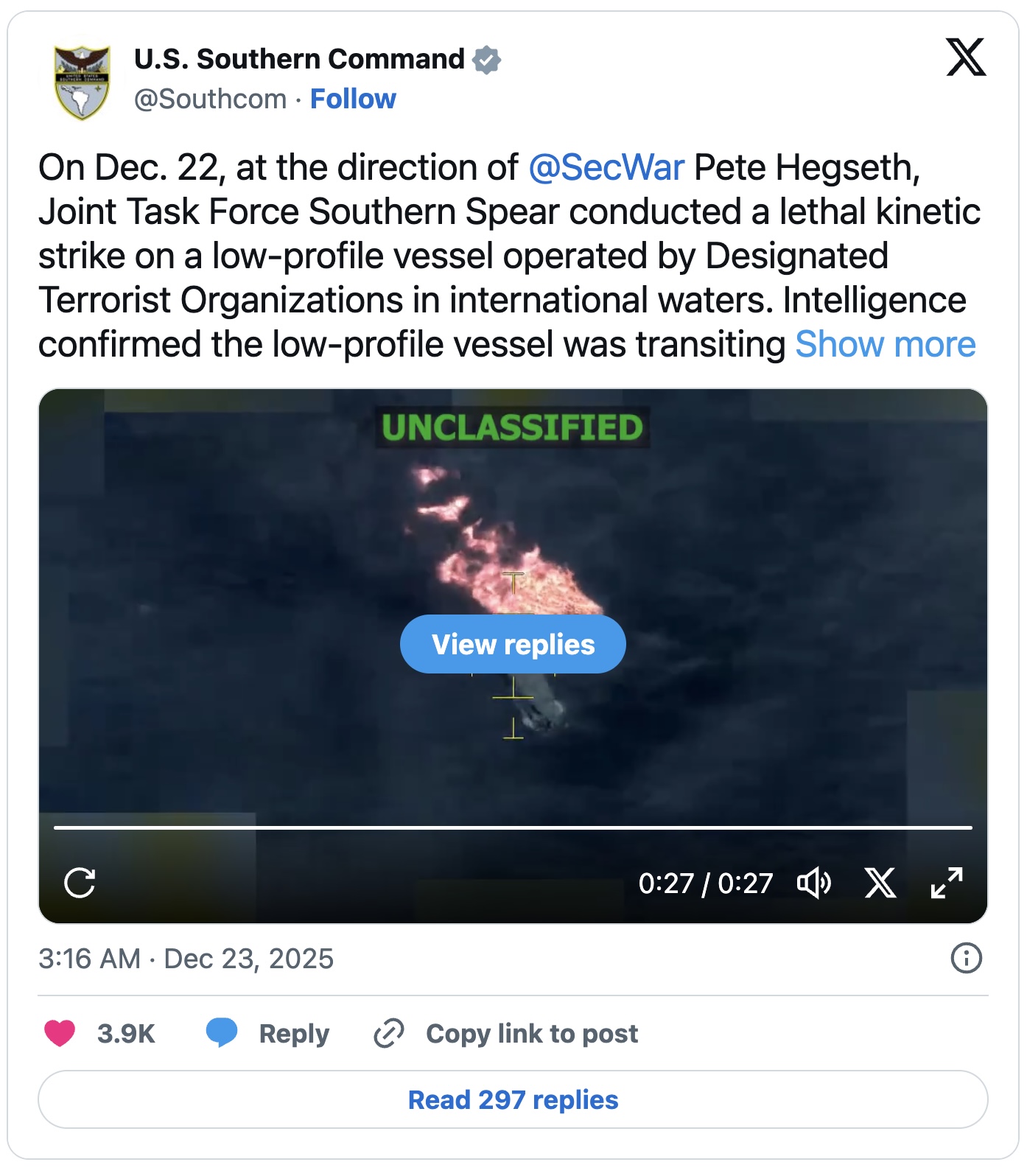 Síðani september hevur USA sprongt í luftina yvir 20 skip í Kyrrahavinum og Karibiska havinum nærhendis Venesuela sum liður í einum hernaðarligum átaki.