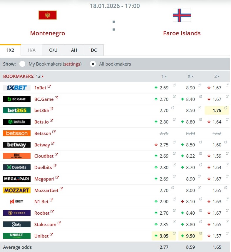 13 altjóða veddingarfyritøkur, ið lata odds upp á dystin geva Føroyum favorittleiklutin móti Montenegro.