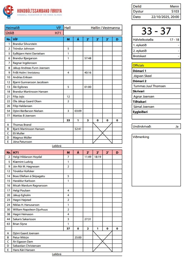 HER ber til frá HSF at síggja dómaraseðlarnar frá dystunum, ið eru leiktir í kvøld.