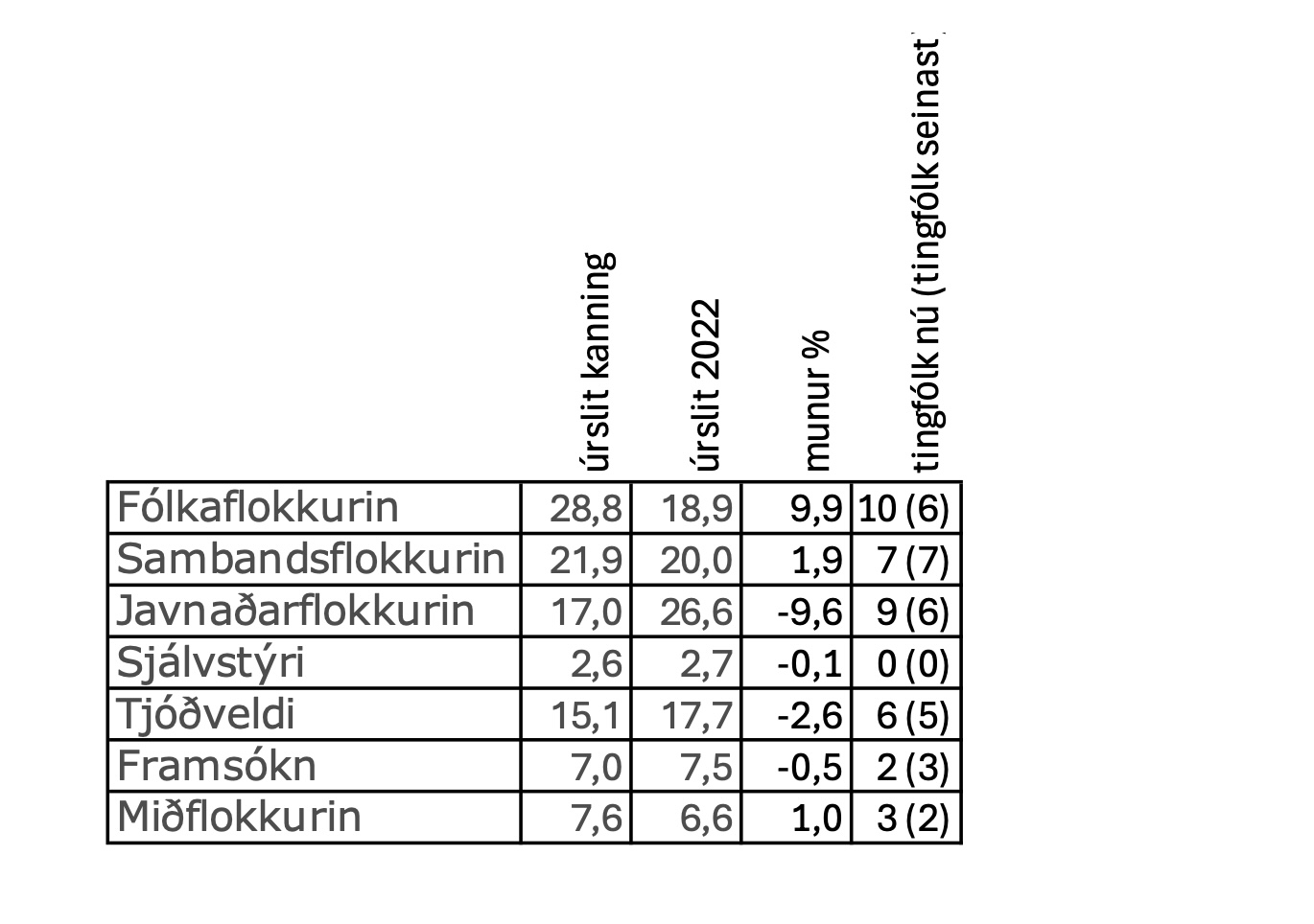 Framsókn hevur eina lítla afturgongd upp á 0,5 prosentstig. Men tað er nóg mikið at missa ein tingsess sambært kanningini. Flokkurin fær 2 tingsessir.
