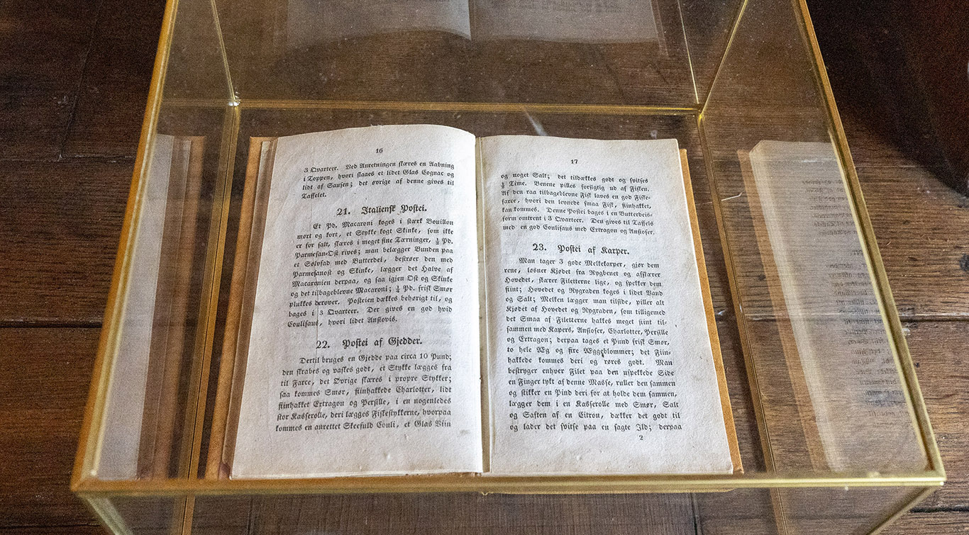 - Hetta er ein tann elsta kókibókin til fínari mat í danska kongaríkinum. Tann, sum vit vísa fram er ein endurprenting frá 1836, sum vit hava stongt inni, tí Apollonia hevur signerað hana. Uppskriftirnar verða brúktar her í húsinum. Eitt nú er rombudingurin, sum vit servera á testovuni, úr bókini.
