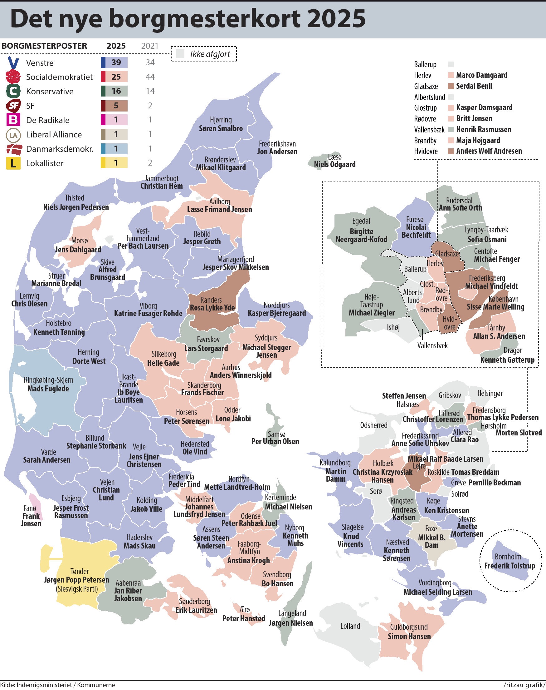 Fleiri av borgarstjórasessunum í Danmark eru komnir uppá pláss eftir kommunuvalið í gjár.