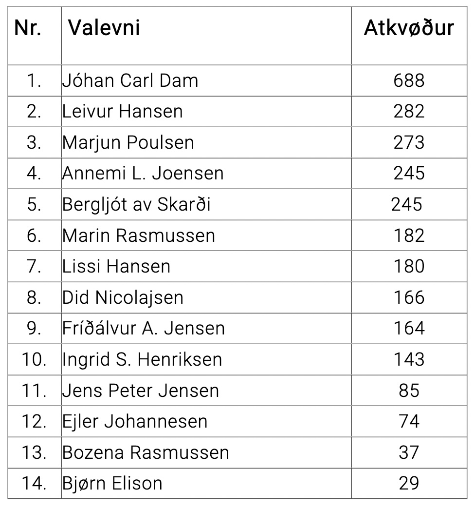 Atkvøðugreiðslan til eldraráðsvalið endaði í dag klokkan 16, og atkvøðurnar eru nú taldar. Av teimum 14 valevnunum, ið stillaðu upp, eru fimm limir og tríggir varalimir valdir í Eldraráðið.