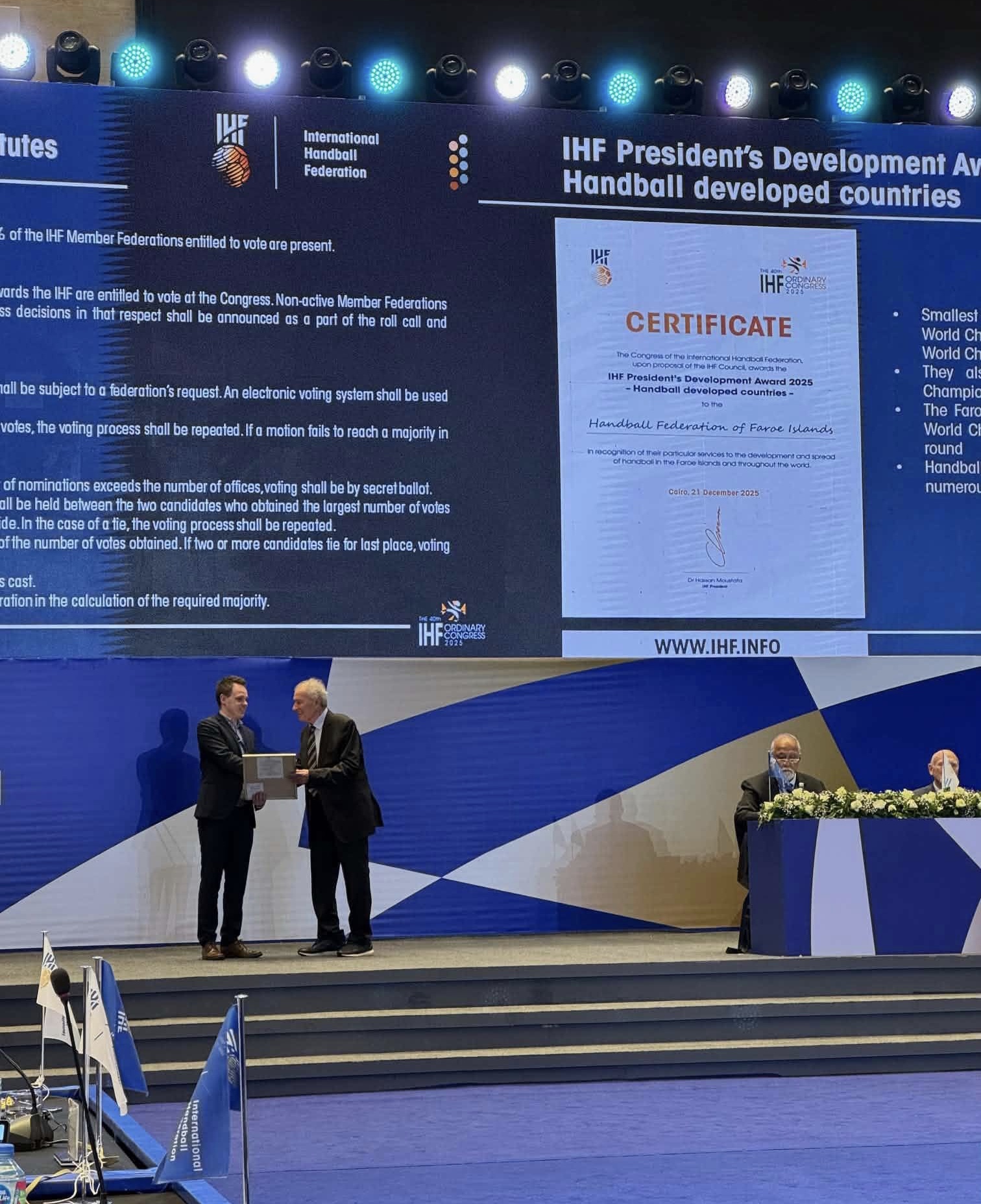 Á IHF-kongressini, sum hevur verið í Kairo seinastu dagarnar, vóru Føroyar í gjár heiðraðar við IHF President´s Development Award.