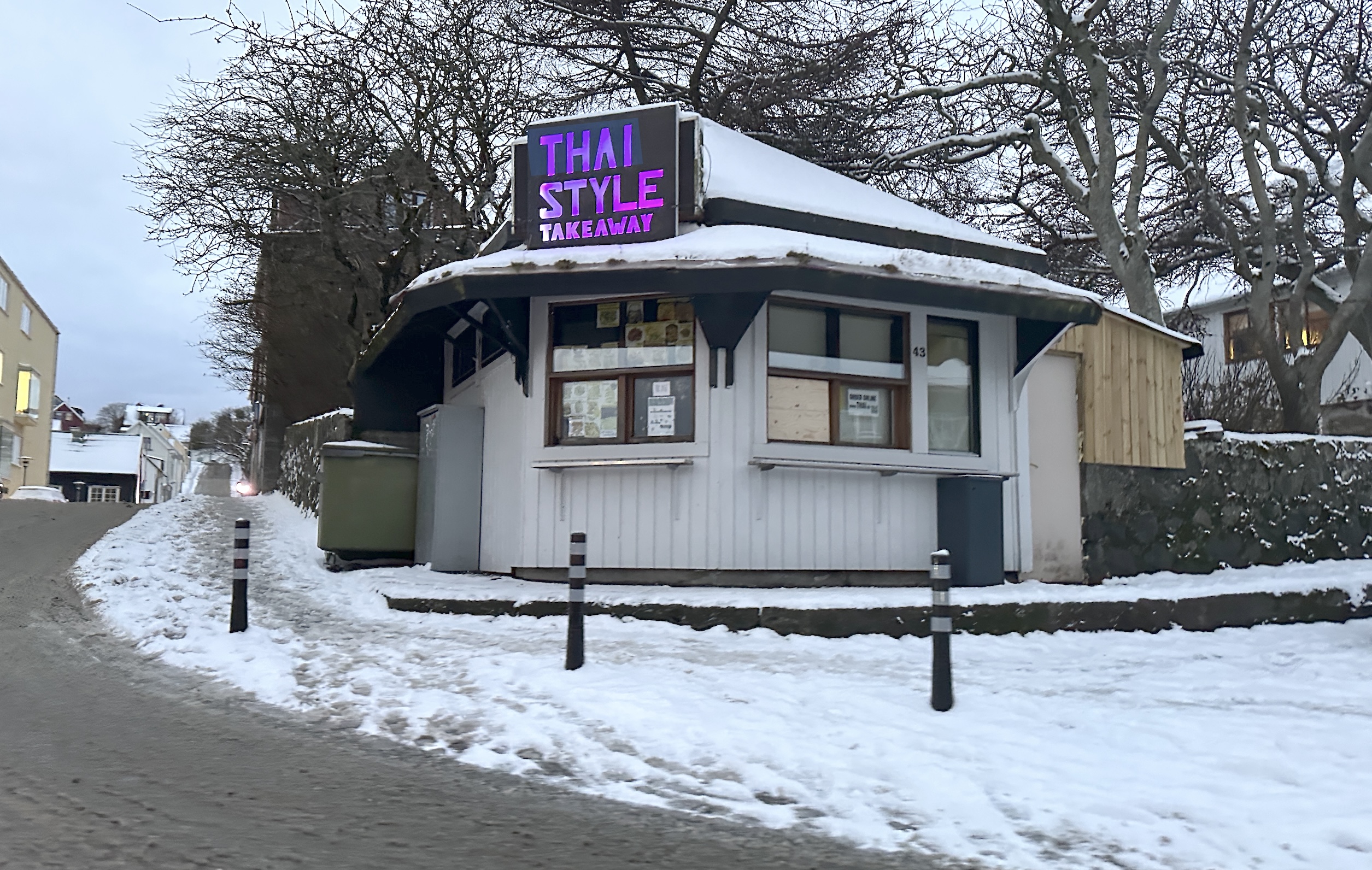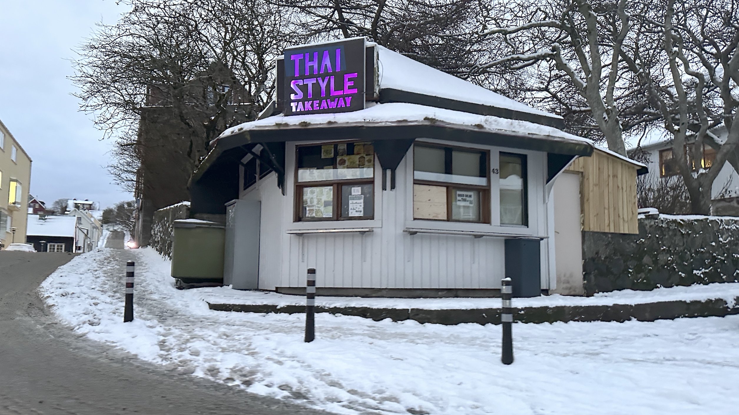 Í gjár fekk løgreglan í Havn fráboðan um, at onkur hevði brotið inn í matsøluna Thai Style í Havn. Tað er thailendska matsølan, sum heldur til í 'Hvítukiosk', sum havnarfólk plagdu at siga. Tað er kioskin á horninum Sjúrðargøta-Hoydalsvegur yvir av Sjónleikarhúsinum.