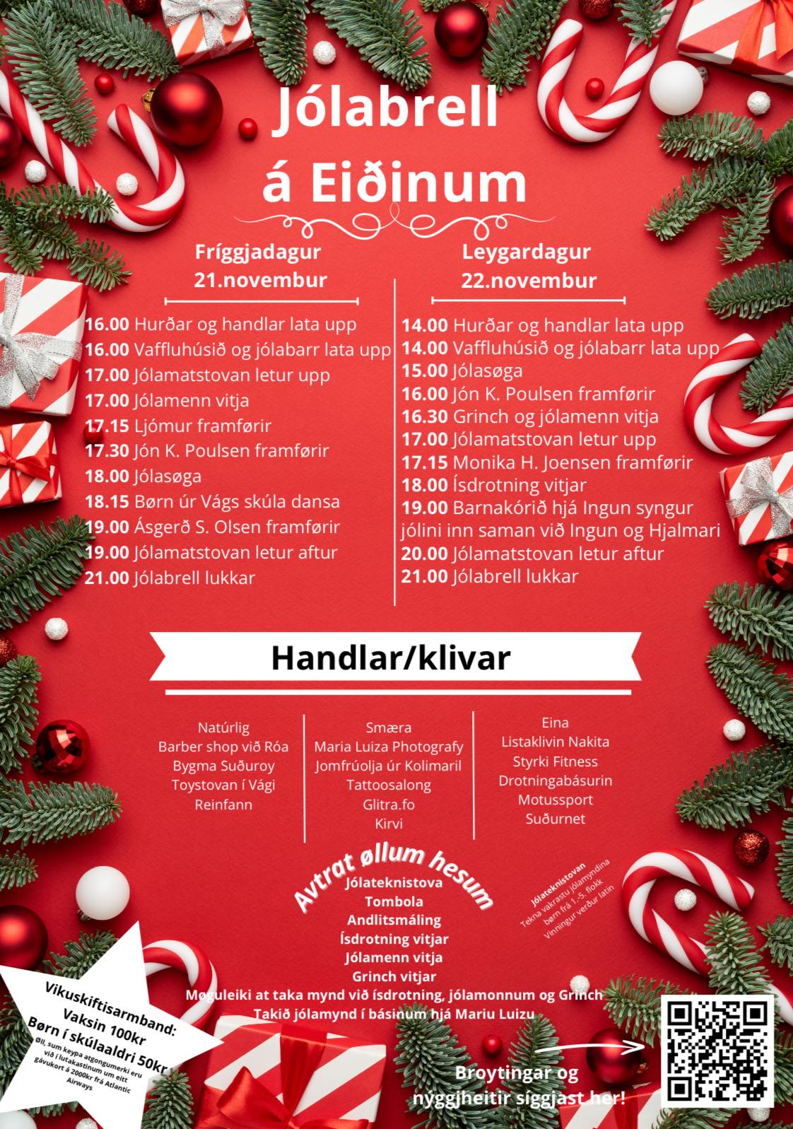 Í morgin, fríggjadagin 21. november kl. 16, lata dyrnar upp til Jólabrell í Vágs Høll. Gjøgnum alt vikuskiftið verður høllin fylt við jólahugna, sølubásum og ymsum tiltøkum.