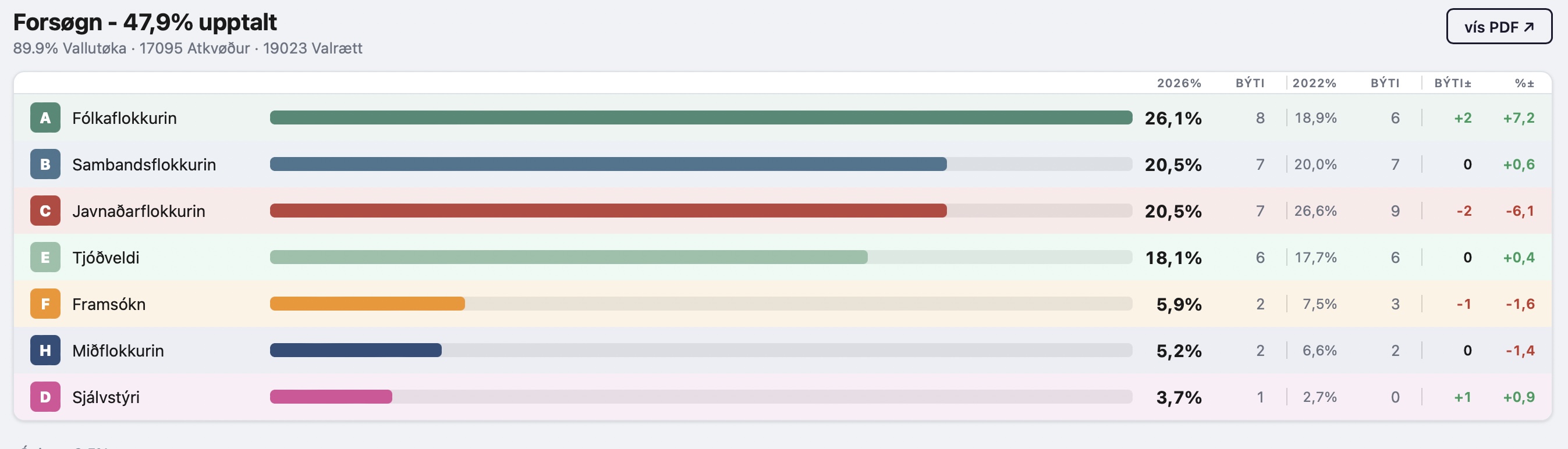 Javnaðarflokkurin stendur til 6,1 prosent afturgongd, sum tó gevur honum 7 tingsessir. Tjóðveldi stendur í stað við 6 tingsessum. Framsókn stendur til at missa 1 tingsess, og Sjálvstýri stendur til at fáa 1 tingsess.
