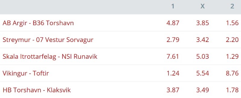 Verður hugt eftir miðaloddsunum hjá altjóða veddingarfyritøkum upp á teir fimm dystirnar, so kann staðfestast, at Víkingur hevur størsta favorittleiklutin. NSÍ hevur eisini ein stóran favorittleiklut, meðan B36 og KÍ hava minni favorittleiklutir. Tað er lítið sum skilir liðini í dystinum millum EB/Streym og 07 Vestur.