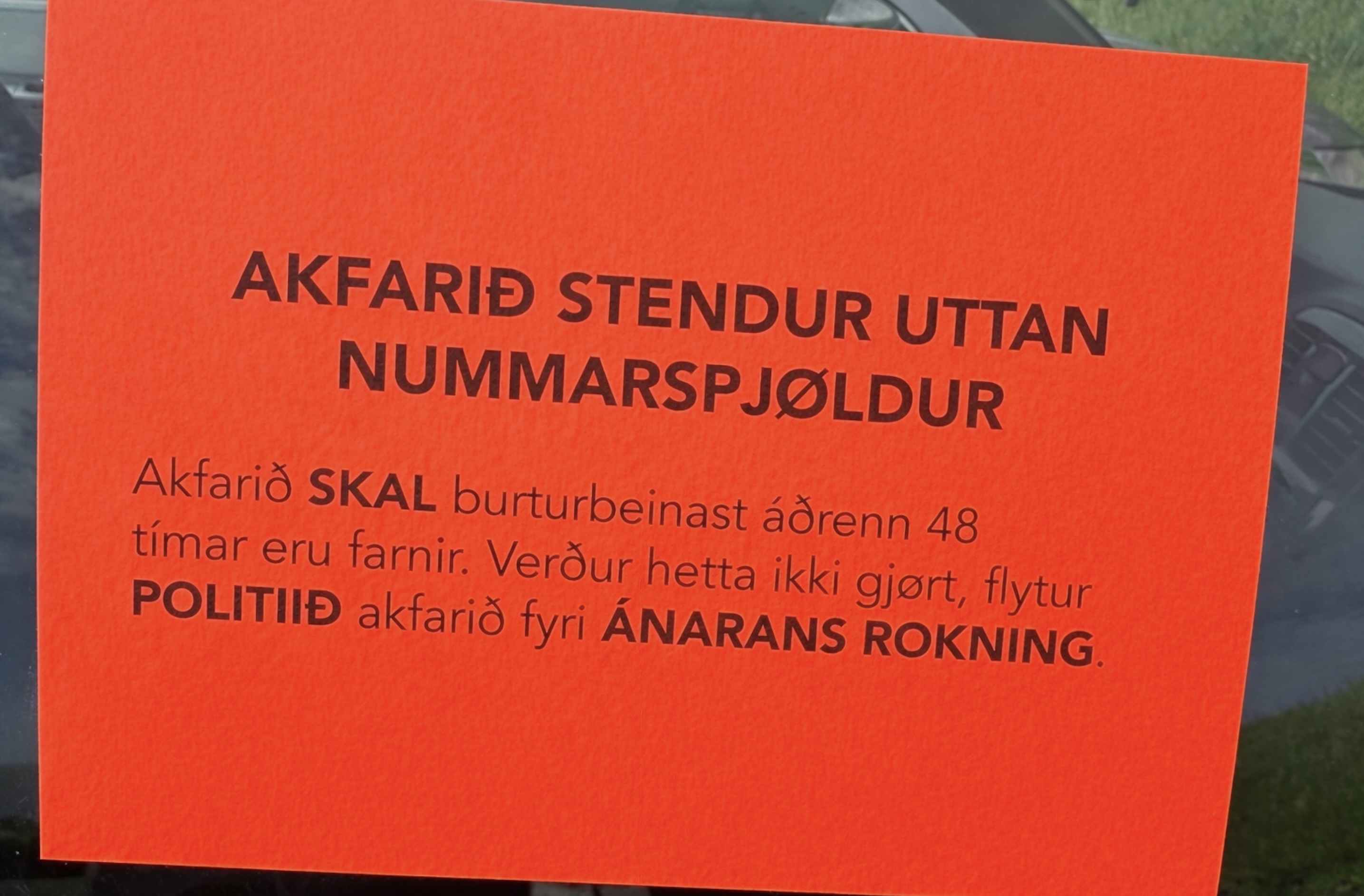 Tá løgreglan klistrar reyða merkið á bilin, so stendur har, at eigarin hevur 48 tímar at flyta bilin av alfaraveg, annars syrgir løgreglan fyri at tað verður gjørt fyri eigarans rokning.