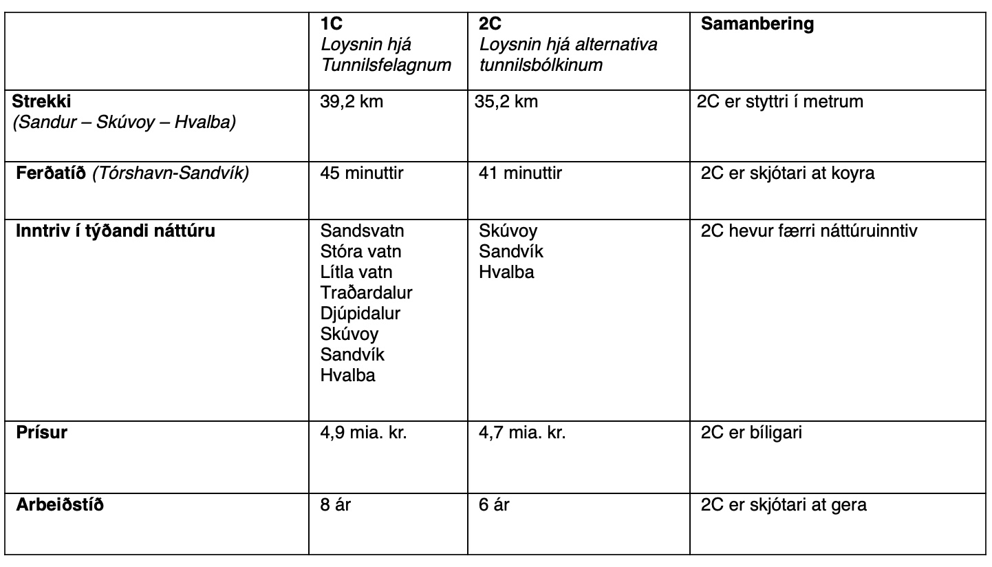 Ein samanbering millum loysnina hjá Tunnilsfelagnum (1C eystan fyri Sandsvatn) og alternativa linjuføringin (2C vestan fyri Sandsvatn) vísir, at alternativa loysnin er styttri, skjótari at koyra, skjótari at gera og bíligari. Ferðatíðin millum Tórshavn og Sandvík verður 41 minuttir við 2C, í mun til 45 minuttir við 1C. Samstundis er arbeiðstíðin mett til 6 ár fyri 2C, í mun til 8 ár fyri 1C, og kostnaðurin er ávikavist 4,7 og 4,9 mia. krónur.