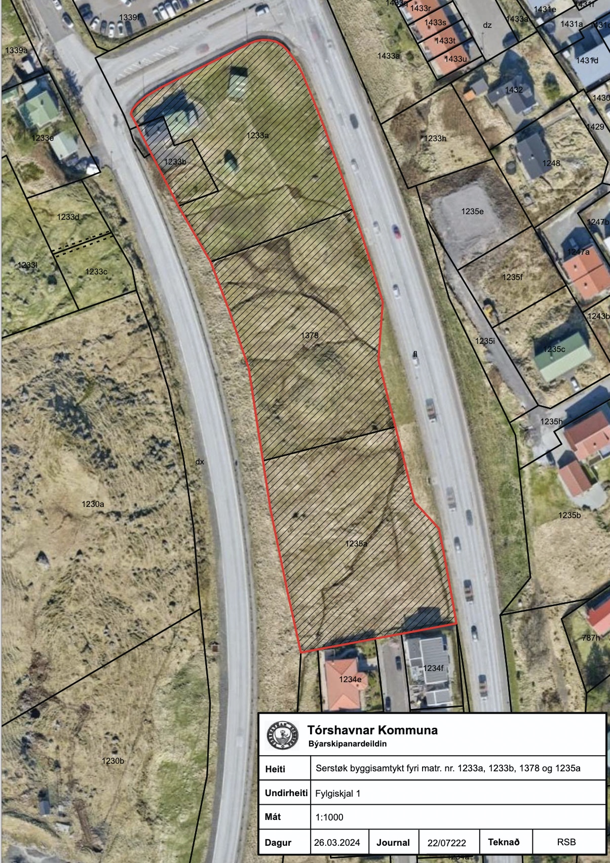 Økið, ið serstaka byggisamtykin er galdandi fyri, er avmarkað, sum sæst á myndunum, og fevnir um tær tríggjar træðirnar, matr. nr. 1233a, 1233b, 1378 og 1235a, Tórshavn og allar jarðarluir, sum eftir góðkenning av hesi byggisamtykt verða frábýttir ella samanlagdir nevndu ogn.