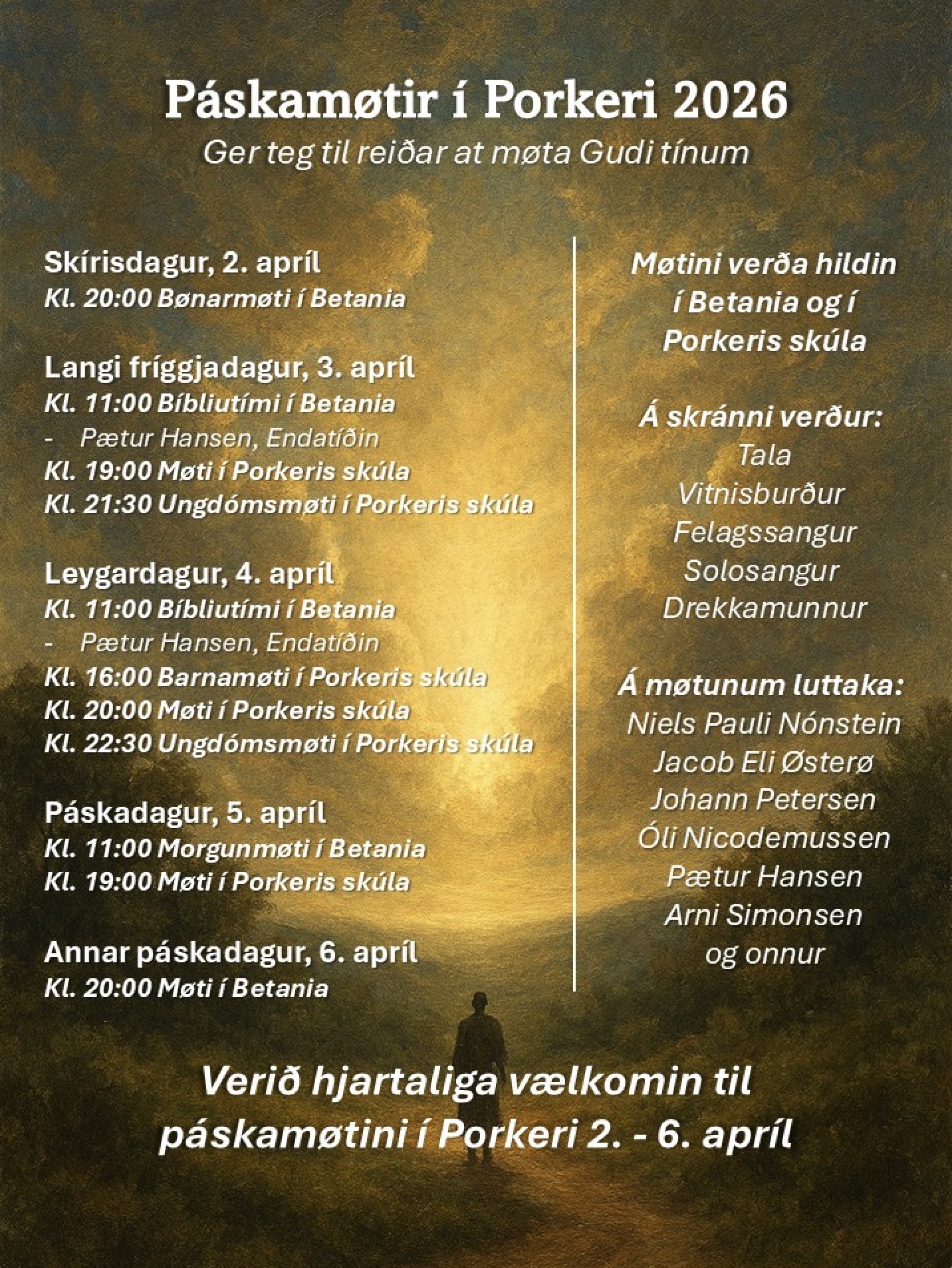 Páskamøtir verða í Porkeri og byrja við bønarmøti í Betania skírisdag kl. 20.00.