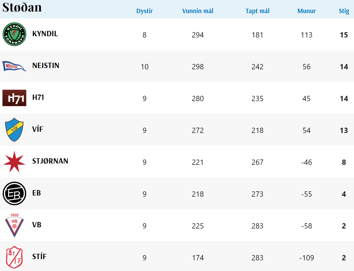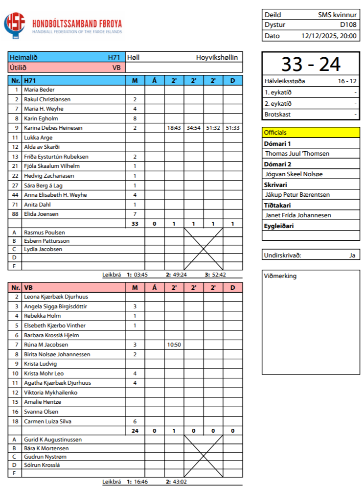 HER ber til frá HSF at síggja dómaraseðilin frá dystinum millum H71 og VB, og støðuna í SMS-deildini: