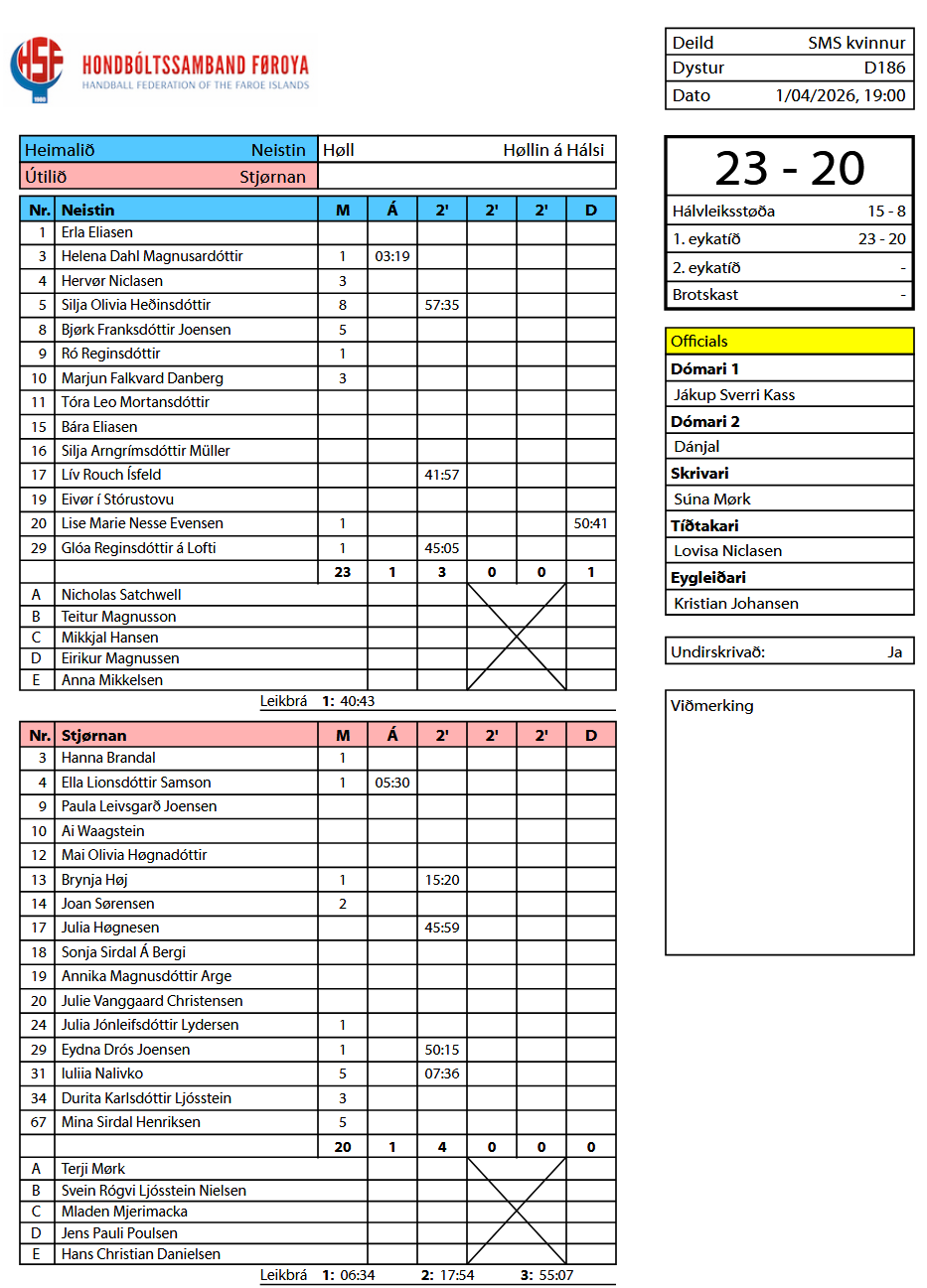 HER ber til frá HSF at síggja dómaraseðilin frá dystinum millum Neistan og Stjørnuna: