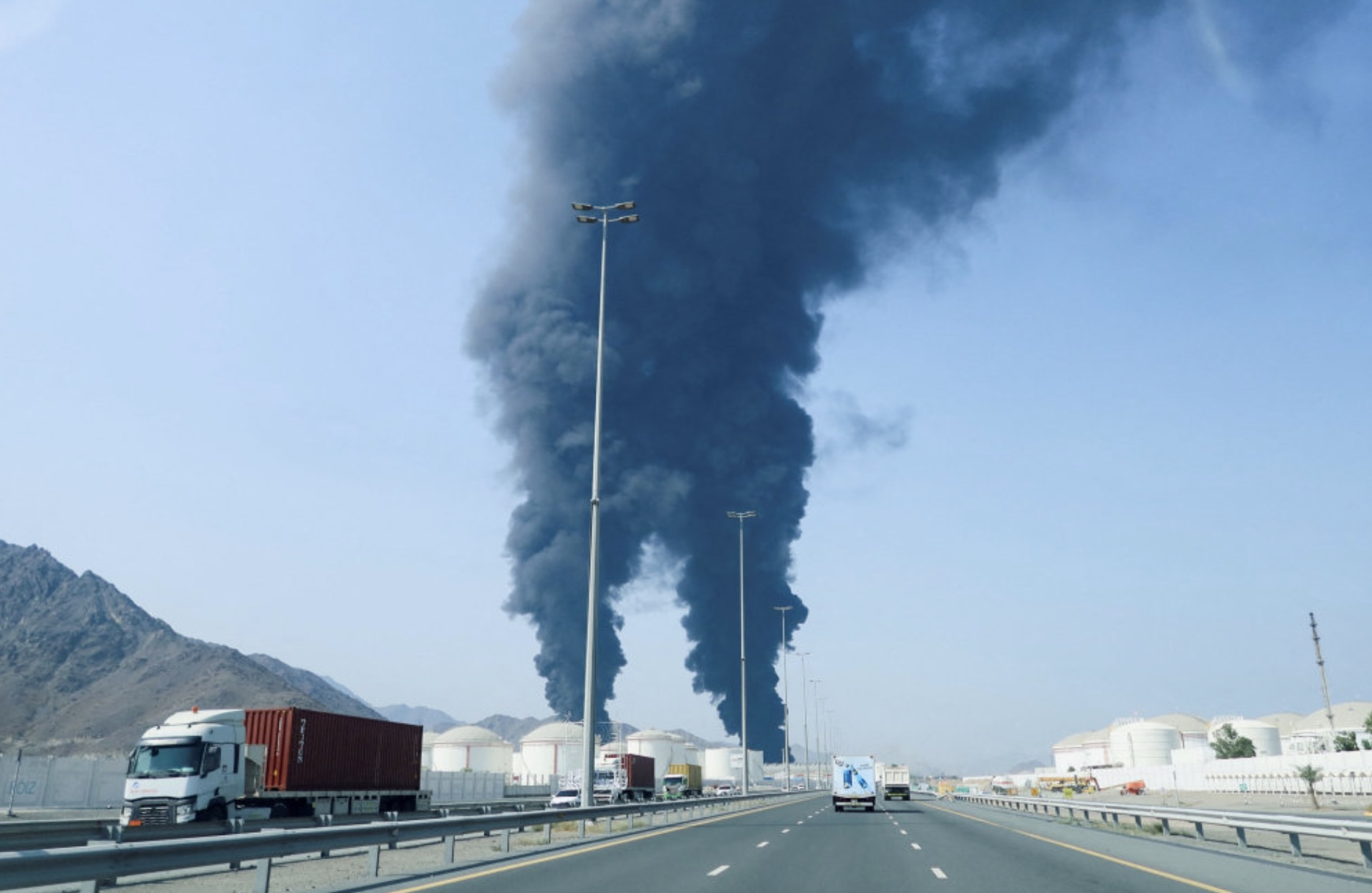 Samstundis vísa myndir úr Fujairah, at svartur roykur sæst.
