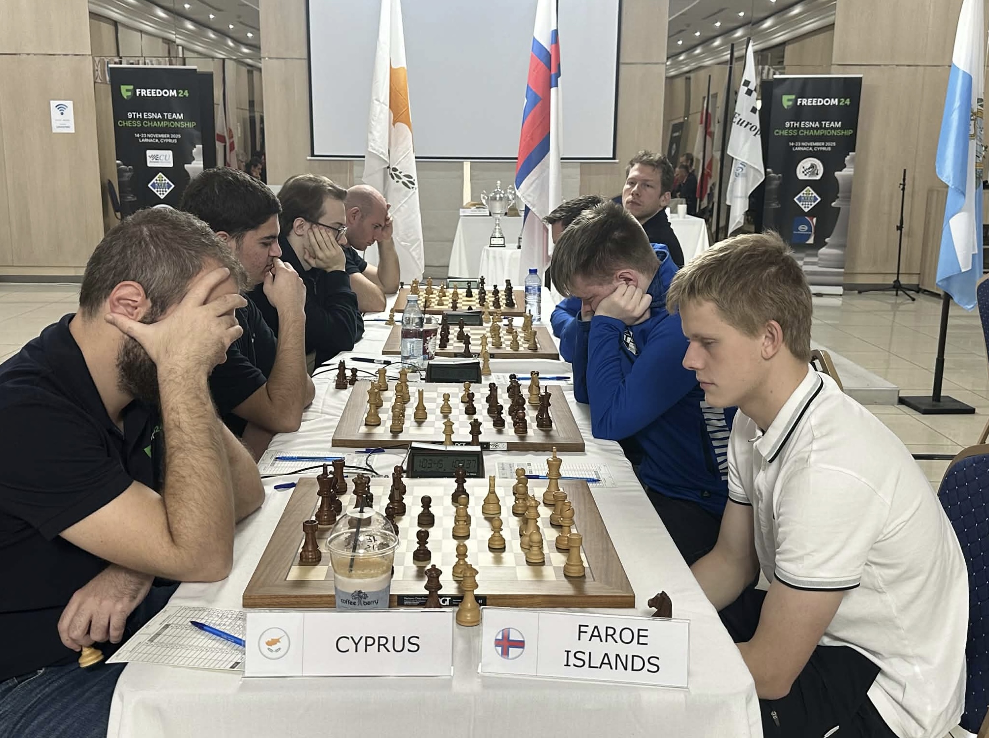 Stórmeistarin Helgi Dam Ziska telvaði eitt ógvuliga stílreint og lýtaleyst talv við svarta fólkinum á fyrsta borði, og vann sannførandi. Jón vann á fjórða borði við hvíta fólkinum í meira rokaligum talvi, sum kundi farið báðar vegir. Í svárari tíðarneyð uppundir evstamark snávaði kýprin.