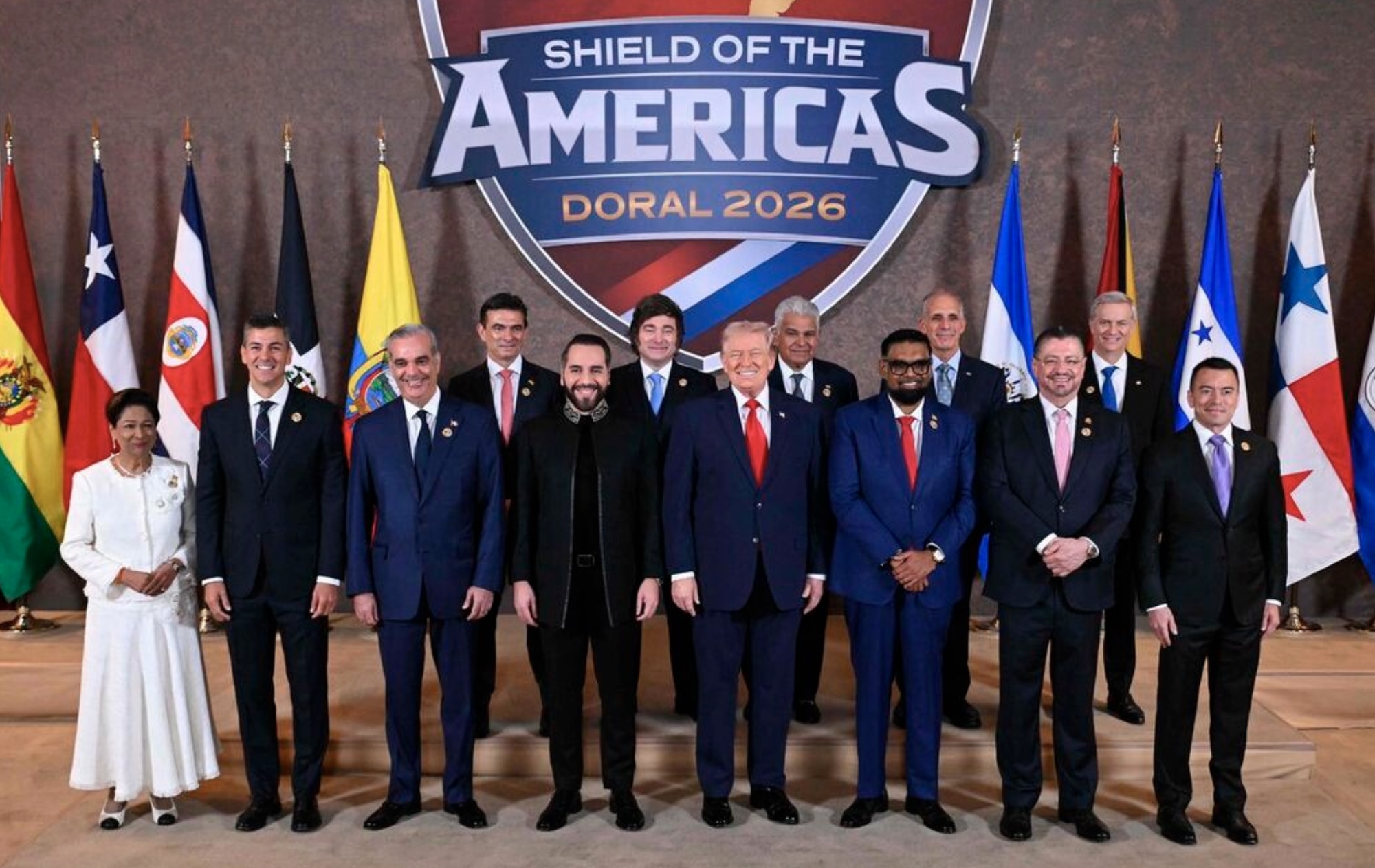 Amerikansk forsetin Donald Trump (C) stands with, (L/R), Trinidad and Tobagos Prime Minister Kamla Persad-Bissessar, Santiago Peña, President of the Republic of Paraguay, Luis Abinader, President of the Dominican Republic, Rodrigo Paz Pereira, President of Bolivia, Nayib Bukele, President of El Salvador, Javier Milei, President of Argentina, José Raúl Mulino, President of Panama, Mohamed Irfaan Ali, President of Guyana, Nasry "Tito" Asfura, President of Honduras, Rodrigo Chaves Robles, President of Costa Rica, José Antonio Kast, President-elect of Chile, and Daniel Roy Gilchrist Noboa Azín, President of Ecuador, during a group photograph at the start of the "Shield of the Americas" Summit at Trump National Doral in Miami, Florida, March 7, 2026. President Trump is hosting a dozen right-wing leaders from Latin America and the Caribbean to discuss issues facing the region, from organized crime to illegal immigration. The summit also aims to serve Washington by boosting US interests in the region and curbing those from foreign powers like China. (Photo by SAUL LOEB / AFP) Byline: Saul Loeb/AFP/Ritzau Scanpix