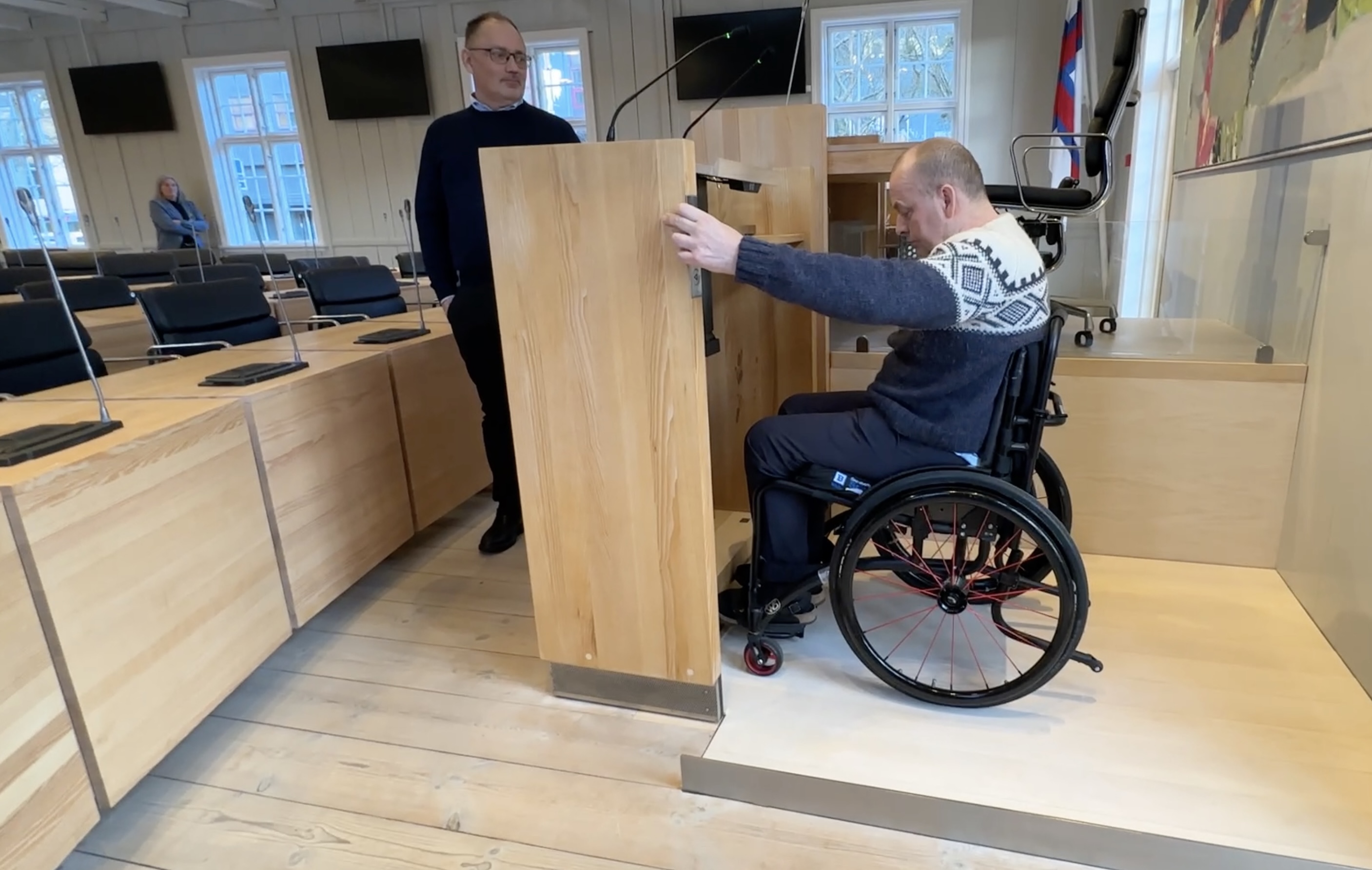 Men fyri at kunna brúkast hjá rørslutarnaðum í koyristóli, so kann hann lorast niður í gólvhædd soleiðis, at ein koyrstólur kann rulla inn á pallin, fyri síðani at lyfta hann upp soleiðis, at um tú situr í koyristóli, so ert tú kortini í somu hædd, sum tey sum standa á røðarapallinum.